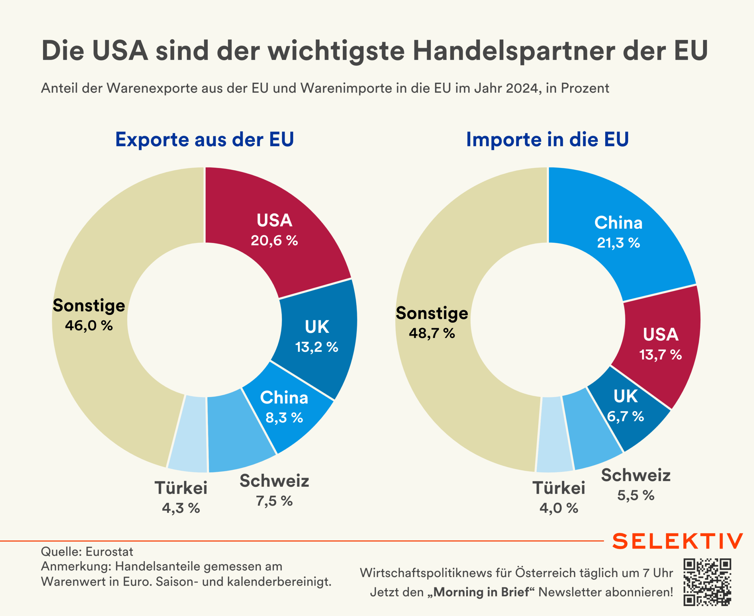 Grafik (von Christoph Hofer): Die USA waren 2024 der wichtigste Exportpartner und der zweitwichtigste (nach China) Importpartner der EU. Gemessen am Warenwert ging zuletzt mehr als ein Fünftel der EU-Exporte in die Vereinigten Staaten (20,6 %), während die USA 13,7 % der EU-Importe stellten. Die EU und die USA sind füreinander der jeweils wichtigste Warenhandelspartner. Die größten Warengruppen, welche die EU in die USA ausführt, sind Medizinprodukte, pharmazeutische Erzeugnisse, Straßenfahrzeuge sowie industrielle Maschinen und Bestandteile. Von den USA in die EU geliefert werden vor allem Erdölerzeugnisse, Medizinprodukte, pharmazeutische Erzeugnisse sowie Kraftmaschinen und deren Ausrüstungen. Einem Warenhandelsüberschuss der EU von 198 Mrd. Euro steht ein Handelsdefizit bei Dienstleistungen von 148 Mrd. Euro gegenüber. [Quellen: Rat der EU/Europäischer Rat, Eurostat | Grafik: USA werden immer wichtiger für österreichische Exporte]