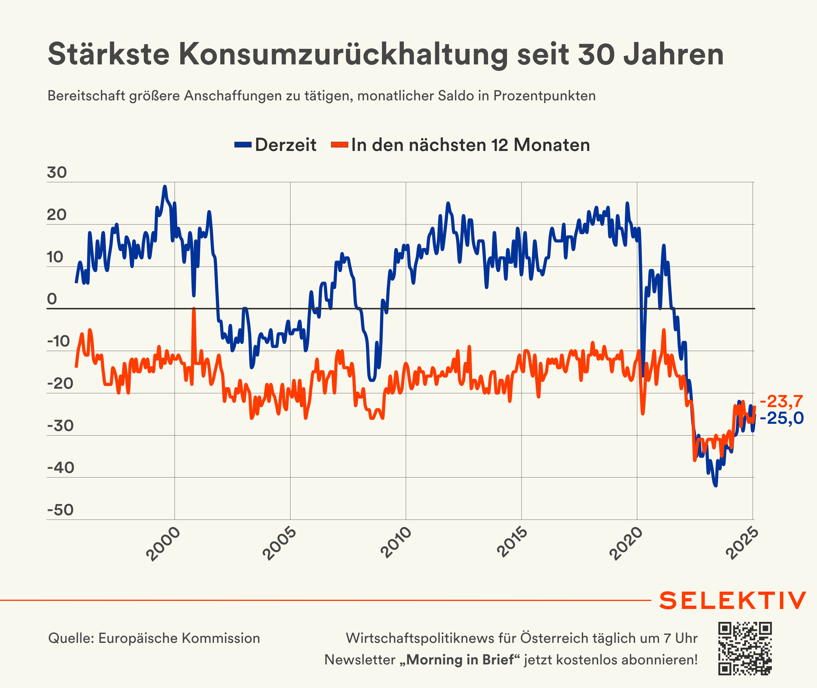 Grafik (von Christoph Hofer): In Österreich ist die Bereitschaft, größere Anschaffungen zu tätigen, seit mehreren Jahren deutlich im negativen Bereich. Das betrifft sowohl „derzeitige“ Anschaffungen als auch jene „in den nächsten 12 Monaten“. Nach dem absoluten Tiefpunkt Mitte 2023 hat sich die Konsumstimmung in Österreich leicht erholt, ist aber weiterhin auf dem schlechtesten Niveau seit 30 Jahren. [Quelle: Eurostat, EU-Kommission]