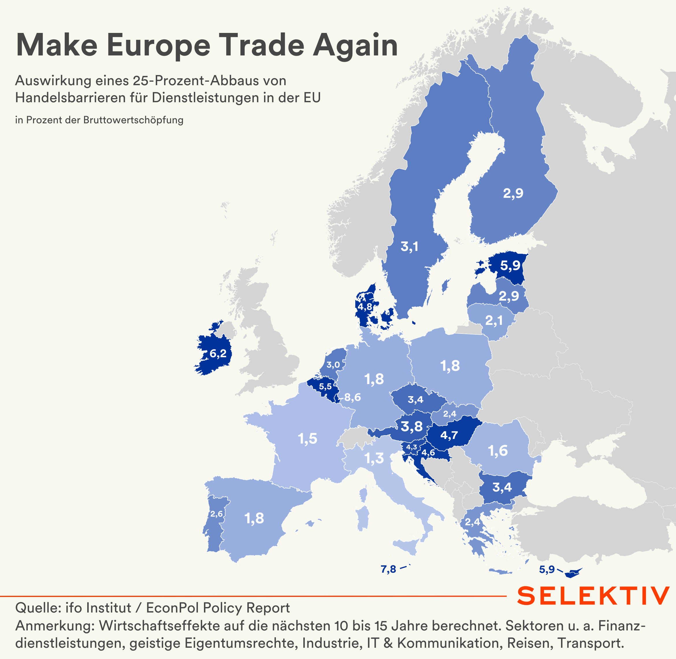 Grafik (von Stephan Frank): Österreich könnte durch eine Vertiefung des EU-Binnenmarkts in den nächsten 10 bis 15 Jahren 3,8 Prozent mehr Wachstum generieren. Eine Reduktion von Hindernissen für Dienstleistungen – z. B. Bürokratie-Abbau oder Angleichung nationaler Regeln – wäre laut ifo-Institut eine passende Antwort auf die von Donald Trump angekündigten Zölle. Dienstleistungen sind seit Jahren der stärkste Wachstumsfaktor in der EU.