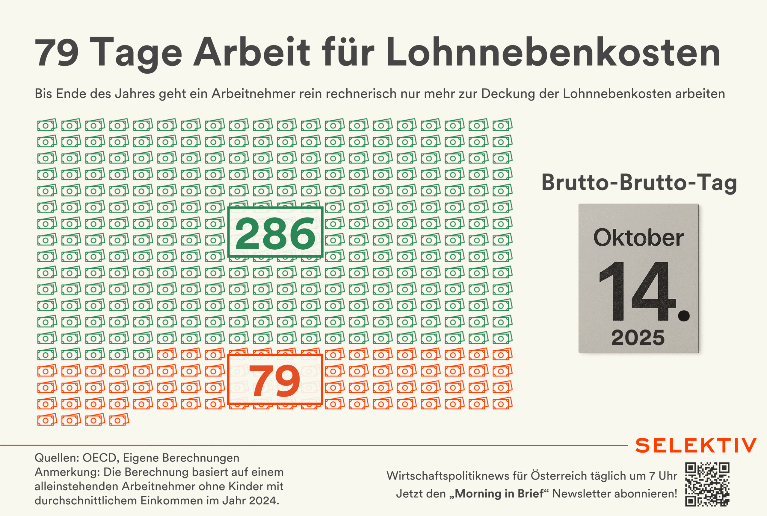 🇦🇹 79 Tage Arbeit für Lohnnebenkosten. Ab dem heutigen „Brutto-Brutto-Tag“ geht ein durchschnittlicher Arbeitnehmer in Österreich rein rechnerisch nur noch zur Deckung der Lohnnebenkosten arbeiten. „Lohnnebenkosten stehen nicht auf dem Gehaltszettel und sind daher für Arbeitnehmer ‚unsichtbar‘. Für Unternehmen sind diese Kosten jedoch eine schwere Last. Wer die preisliche Wettbewerbsfähigkeit wieder herstellen werden, muss also auch über diesen Kostenblock sprechen“, so Matthias Reith von Raiffeisen Research zu Selektiv. [Quelle: Selektiv | Grafik]