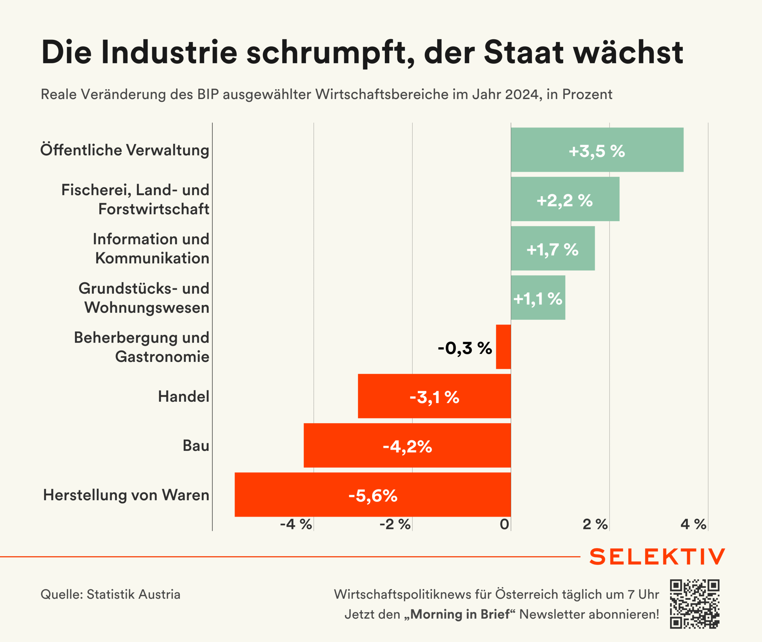 🇦🇹 Österreichs Industrie verharrt in der Rezession. Im 2. Quartal 2025 belief sich der Umsatz von Unternehmen im produzierenden Gewerbe auf insgesamt 95,3 Mrd. Euro – ein Minus von 0,9 % im Vergleich zum Vorjahreszeitraum. Damit befindet sich die Industrie bereits das 9. Quartal in Folge in einer Rezession. Die Chemie- und Pharmaindustrie konnte ihren Umsatz im 2. Quartal um mehr als 10 % steigern. Rückgänge gab es hingegen in der Textilindustrie (-5,4 %), Papierbranche (-4,0 %) und im Automobilsektor (-3,9 %). Die Zahl der Beschäftigten in der Industrie ging im Jahresvergleich um 1,8 % zurück – das bedeutet einen Abbau von rund 19.400 Jobs. Am stärksten traf es die Automobilbranche mit einem Minus von 9,8 %. Auch die Exporte brachen ein: Im 2. Quartal sanken die Ausfuhren gegenüber dem Vorjahr um 3,0 % auf insgesamt 46,4 Mrd. Euro. [Quelle: EY | Grafiken: Die Industrie schrumpft, der Staat wächst | Handelsbilanz rutscht 2025 ins Negative]