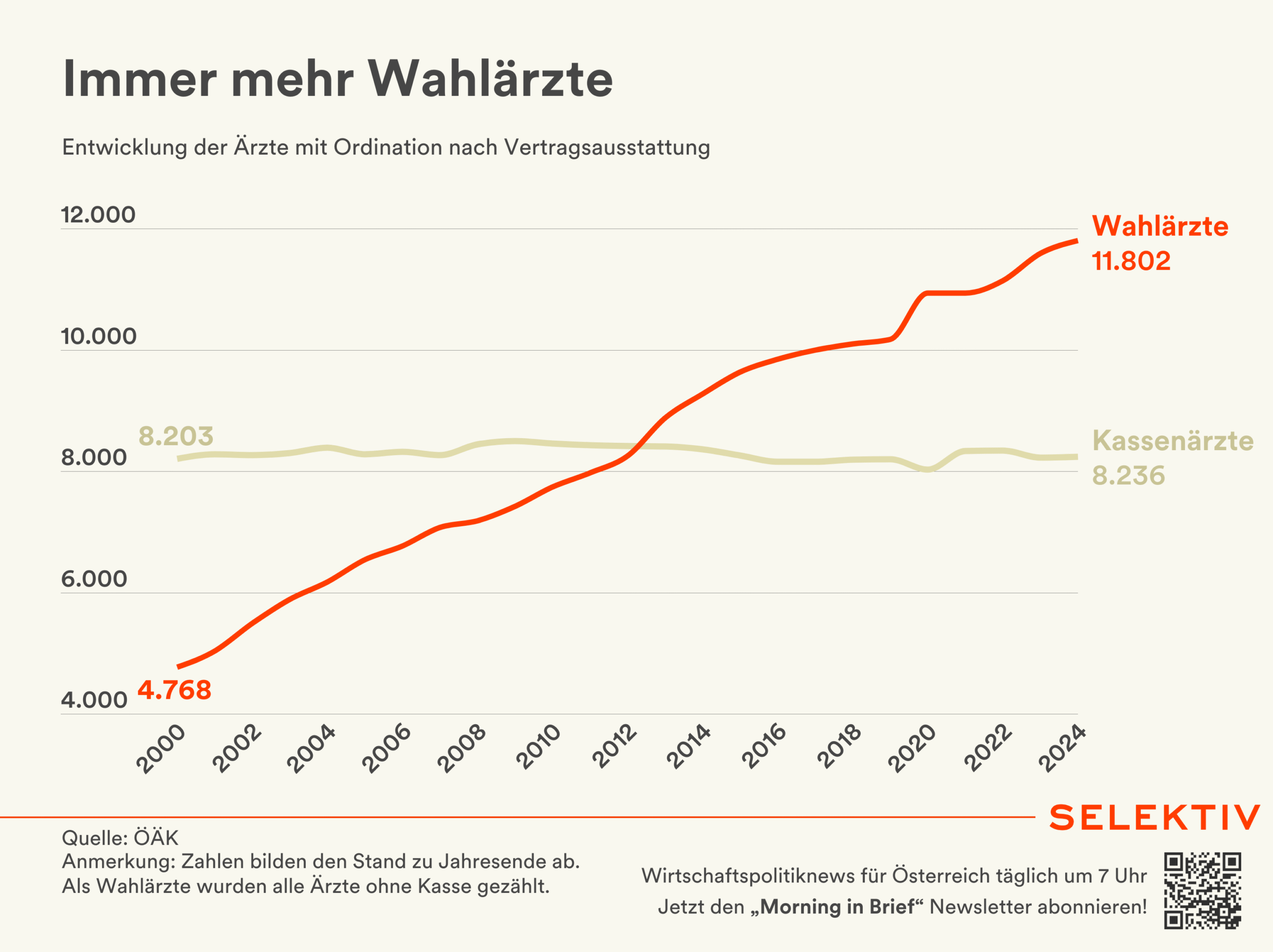 🇦🇹 Rechnungshof empfiehlt Entmachtung von Landesärztekammern. Der Rechnungshof (RH) kritisiert in einem Bericht, dass seit 2019 kein bundeseinheitlicher Gesamtvertrag mit der Ärztekammer möglich war, da jede Landesärztekammer diesem zustimmen müsse. Der Rechnungshof empfiehlt eine Gesetzesänderung, damit diese Vorgabe in Zukunft entfalle. Dies sei nötig, um die Versorgung mit kassenfinanzierten Sachleistungen zu sichern und das Wachstum des Wahlarztbereichs einzudämmen. Die Planstellen in der Allgemeinmedizin bezogen auf die Gesamtbevölkerung sanken von 2019 bis 2023 um 5,1 %. Der RH plädiert zudem für Selbstbehalte und eine Neuregelung der Zahlungsströme für den spitalsambulanten und niedergelassenen Bereich nach dem Prinzip „Geld folgt Leistung“. [Quelle: Rechnungshof | Reaktionen: BMASGPK, FPÖ, SPÖ, Grüne, Dachverband der SV-Träger, Ärztekammer | Grafik: Immer mehr Wahlärzte]