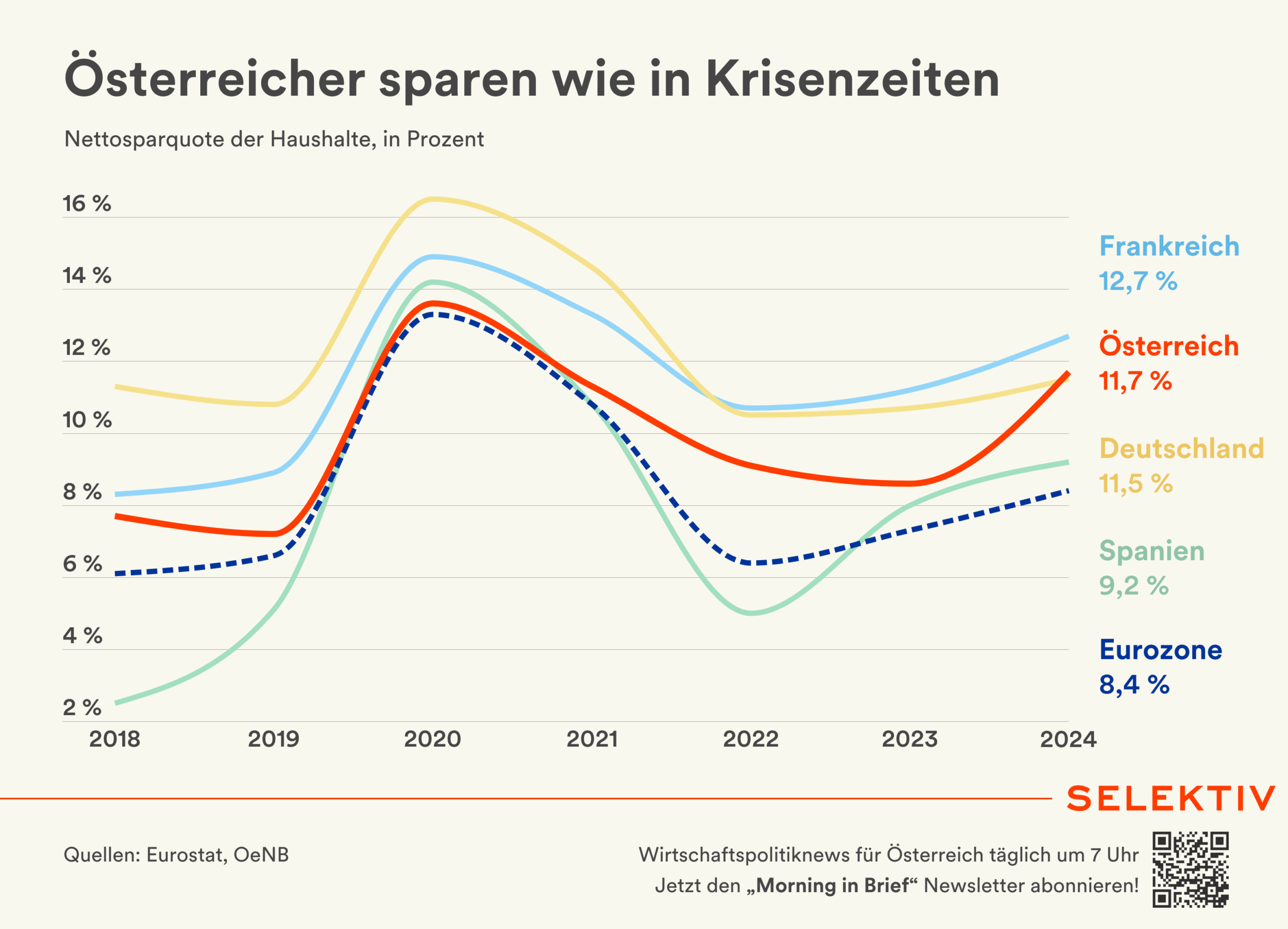 💡 Sparquote erreicht Covid-Krisenniveau. Die Nettosparquote österreichischer Haushalte stieg 2024 auf 11,7 % – der höchste Wert seit dem Pandemie-Höchststand von 13,6 % im Jahr 2020. Der typische Median-Haushalt sparte rund 300 Euro pro Monat. Im internationalen Vergleich ist Österreichs Nettosparquote von 2023 auf 2024 deutlich stärker gestiegen als im Euroraum-Schnitt (8,4 %) und übertraf auch jene in Deutschland (11,5 %). Gründe für die verstärkte Sparneigung sind u. a. die geopolitische Unsicherheit und die schwache Konjunktur. Laut OeNB-Prognose soll die Sparquote 2025 wieder auf 10,7 % sinken. [Quelle: OeNB | Grafik von Christoph Hofer]