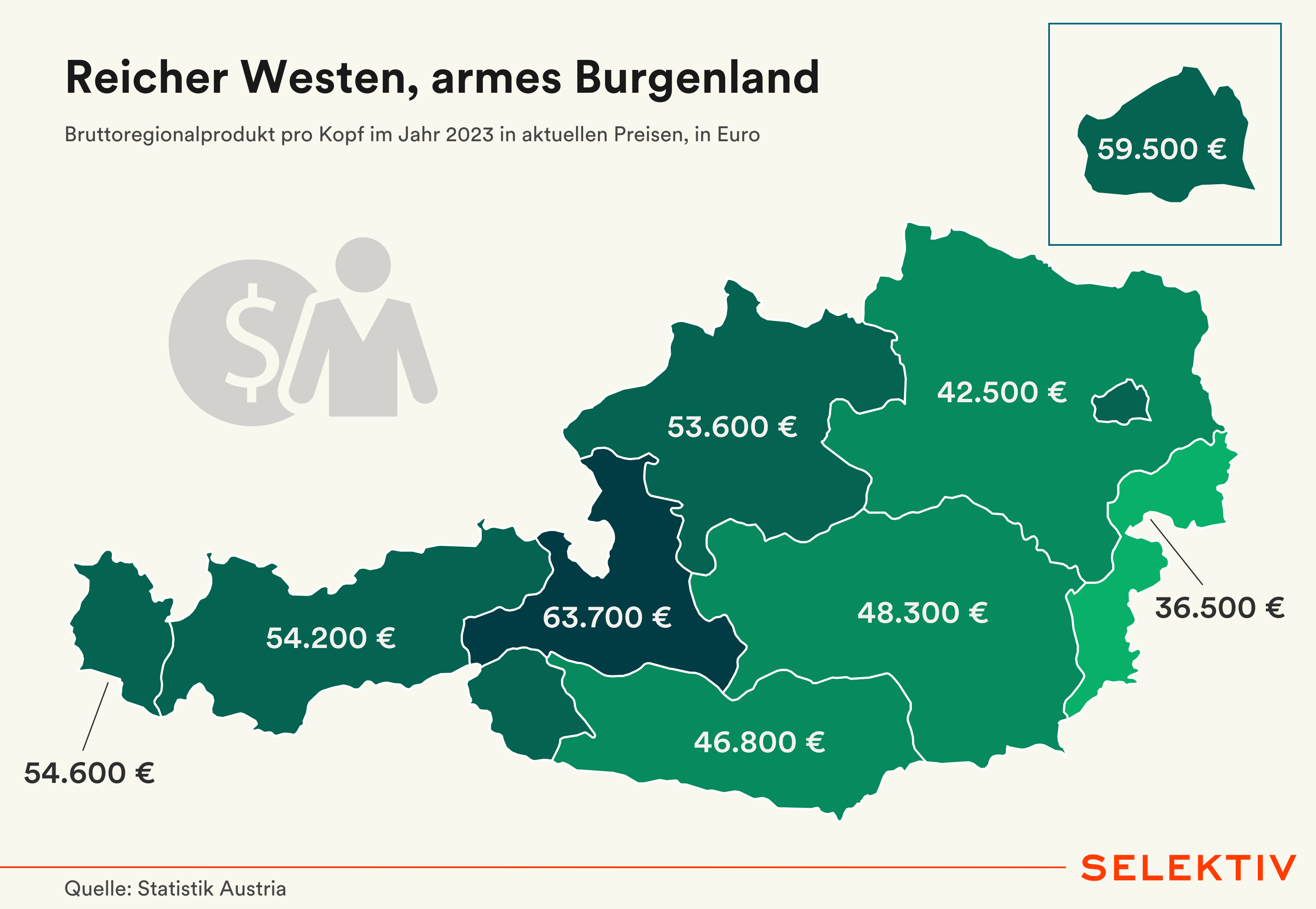 Grafik (von Christoph Hofer): Das österreichische Bruttoinlandsprodukt pro Kopf betrug 2023 51.800 Euro. Regional ergeben sich teils erhebliche Unterschiede. Während der Westen Österreichs überdurchschnittlich reich ist (Vorarlberg: 54.600 Euro; Tirol: 54.200 Euro; Salzburg: 63.700 Euro), hinkt das Bruttoregionalprodukt pro Kopf im Burgenland deutlich hinterher (36.500 Euro). Vor allem in und rund um große Städte zeigt sich eine höhere Wirtschaftsleistung pro Kopf. [Quelle: Statistik Austria]