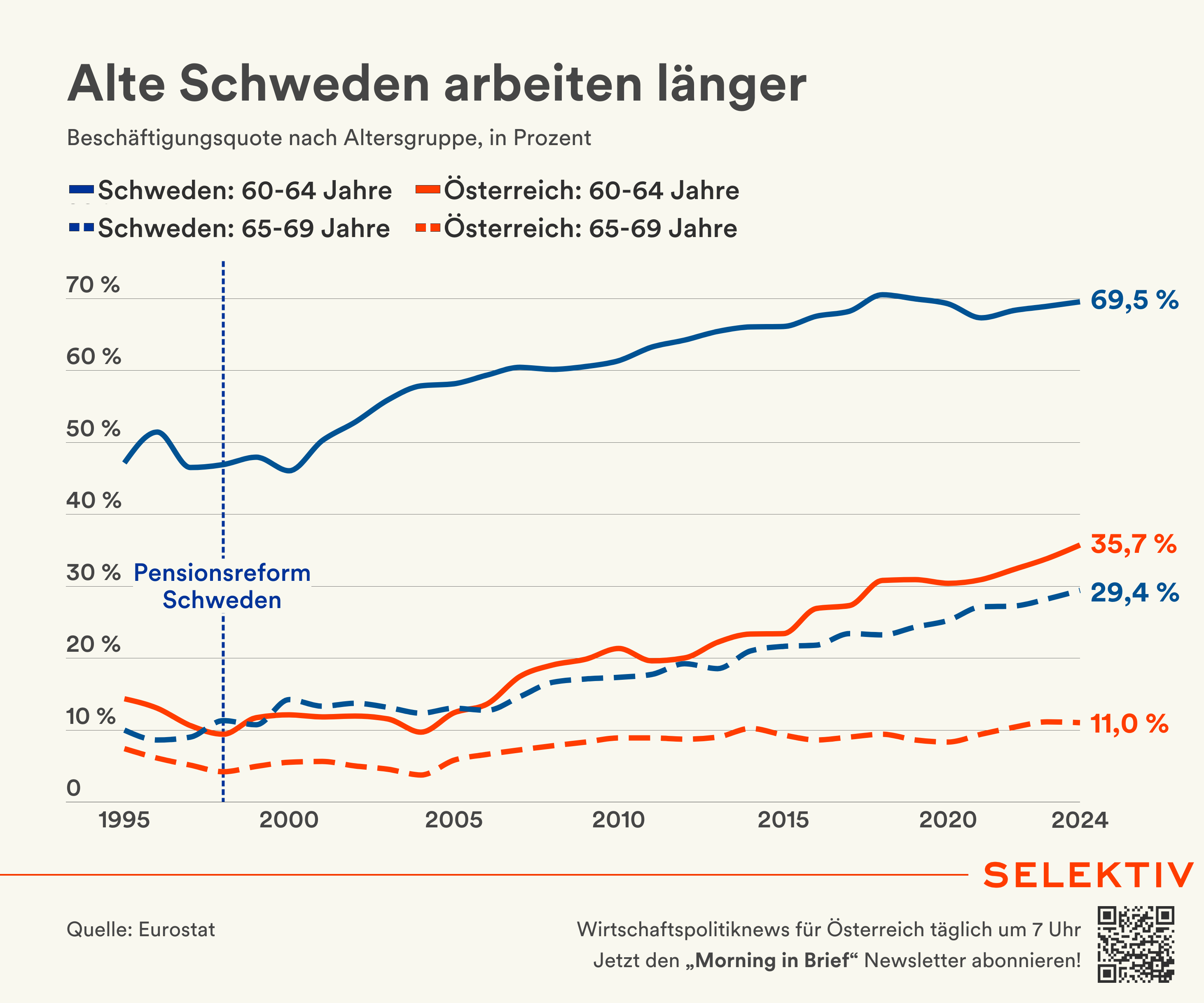 🇦🇹 Bundesregierung beschließt „Aktivpension“. Für Erwerbstätige, die den Pensionsantritt aufschieben oder zusätzlich zur Alterspension weiterarbeiten, wird ab 1. Jänner 2027 ein steuerlicher Freibetrag von 15.000 Euro pro Jahr eingeführt. Zusätzlich entfällt der Dienstnehmerbeitrag zur Pensionsversicherung i. H. v. 10,25 %. Der Dienstgeberanteil wird weiterhin fällig und fließt in den Arbeitsmarkttransformationsfonds. Diese Regelungen gelten auch für Selbstständige. Aktuell sind rund 150.000 Personen über das gesetzliche Pensionsantrittsalter hinaus beschäftigt. Das Paket der „Aktivpension“ kostet insgesamt 470 Mio. Euro – 200 Mio. macht der Entfall der Pensionsbeiträge aus, 170 Mio. der Steuerentfall und 100 Mio. sollen in Beschäftigungsmaßnahmen investiert werden. [Quellen: Pressefoyer nach dem Ministerrat, Bundeskanzleramt, Ministerratsvortrag | Reaktionen: ÖVP, SPÖ, FPÖ, Neos, IV, WKÖ, ÖSB, GPA, PVÖ, ÖAAB, WB | Grafik: Alte Schweden arbeiten länger]