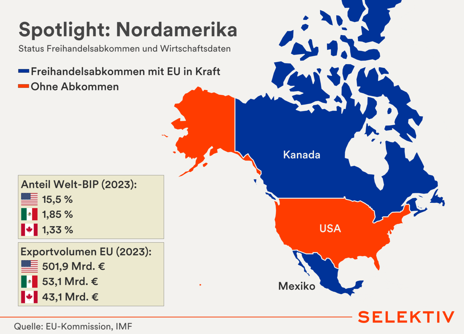Grafik: Während zwischen Europäischer Union und Mexiko bereits seit dem Jahr 2000 ein Freihandelsabkommen in Kraft steht, fehlt ein solches mit den USA weiterhin. Knapp jede fünfte EU-Exportware wurde 2023 in den USA abgesetzt. Das nach langer Auseinandersetzung beschlossene CETA-Abkommen mit Kanada ließ den bilateralen Handel zwischen 2016 und 2022 um 65 Prozent steigen und schuf laut EU-Kommission 70.000 neue Arbeitsplätze in der EU.