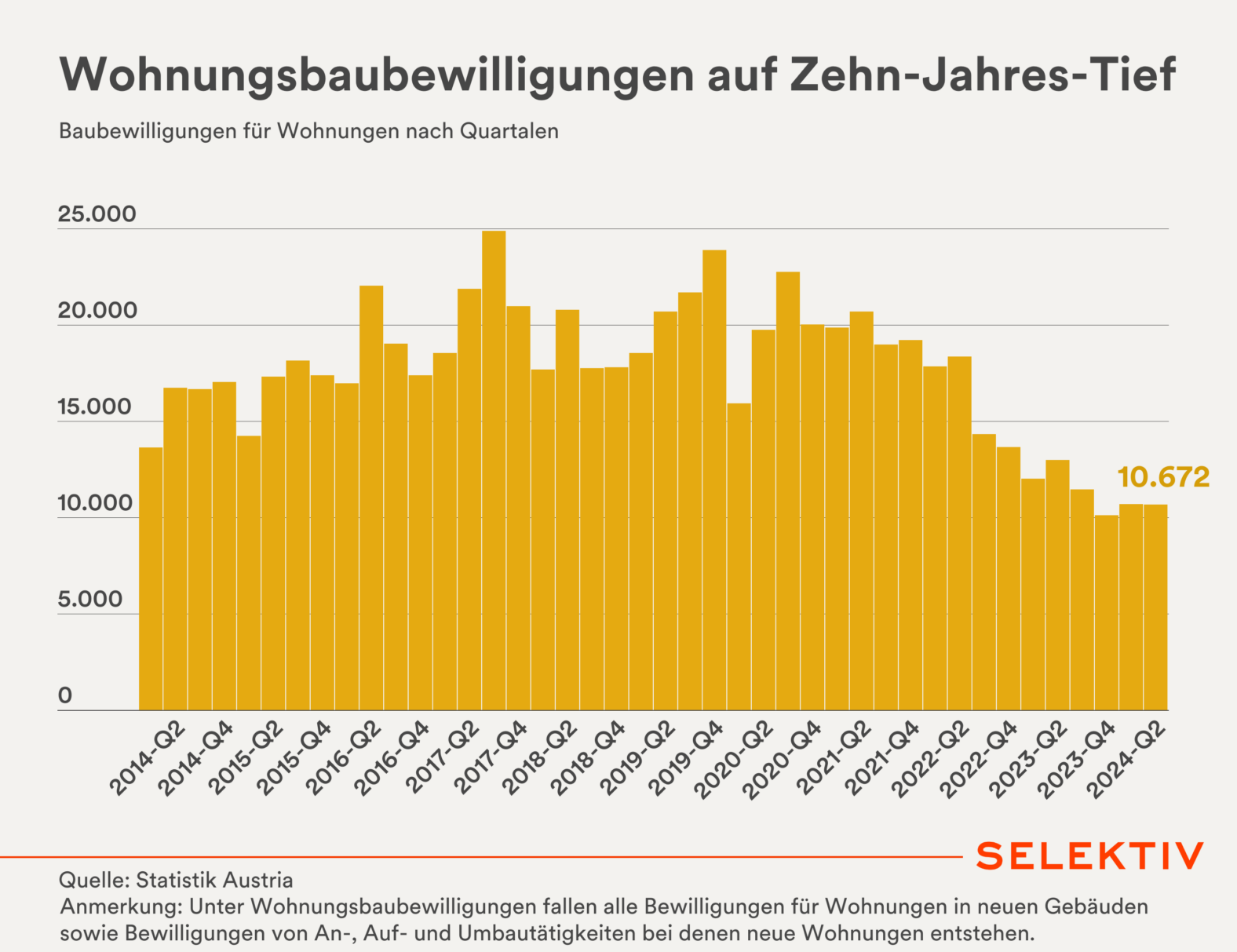 Grafik (von Christoph Hofer): Österreichweit befindet sich die Wohnbautätigkeit auf einem Zehn-Jahres-Tiefpunkt. 10.672 Baubewilligungen für Wohnungen im 2. Quartal 2024 bedeuten einen Rückgang der Bautätigkeit im Vergleich zum Vorjahresquartal um 17,86 Prozent. In den Spitzenjahren 2017 oder 2019 gab es knapp doppelt so viele Baubewilligungen.