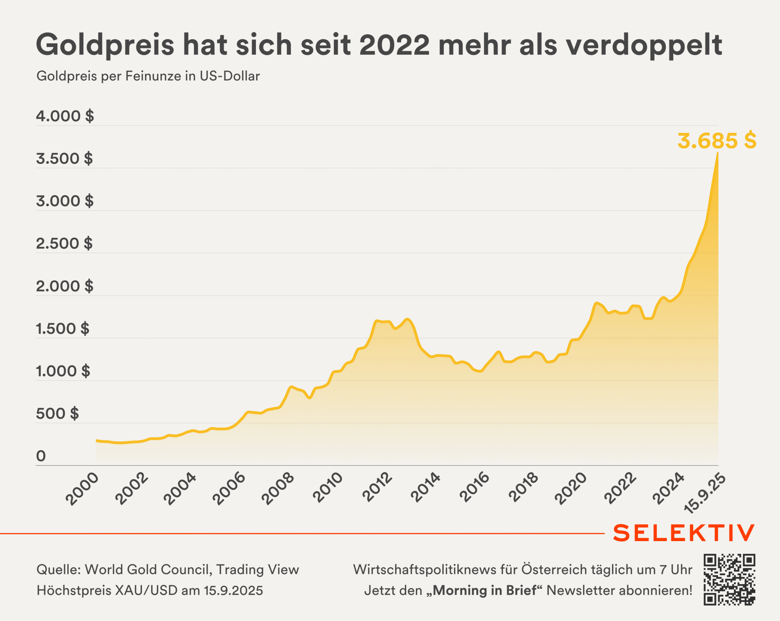 🌐 Goldpreis: Erneuter Rekord. Die für Mittwoch erwarteten Zinssenkungen durch die US-Zentralbank Federal Reserve haben den Goldpreis erneut auf ein Rekordhoch getrieben. Gestern wurde ein Höchstpreis von 3.685 US-Dollar pro Feinunze verzeichnet. Im laufenden Jahr ist der Goldpreis in US-Dollar gemessen bereits um über 40 % gestiegen, alleine im letzten Monat um über 10 %. [Quellen: Fxstreet, Tradingview | Grafik: Goldpreisentwicklung seit 2000]