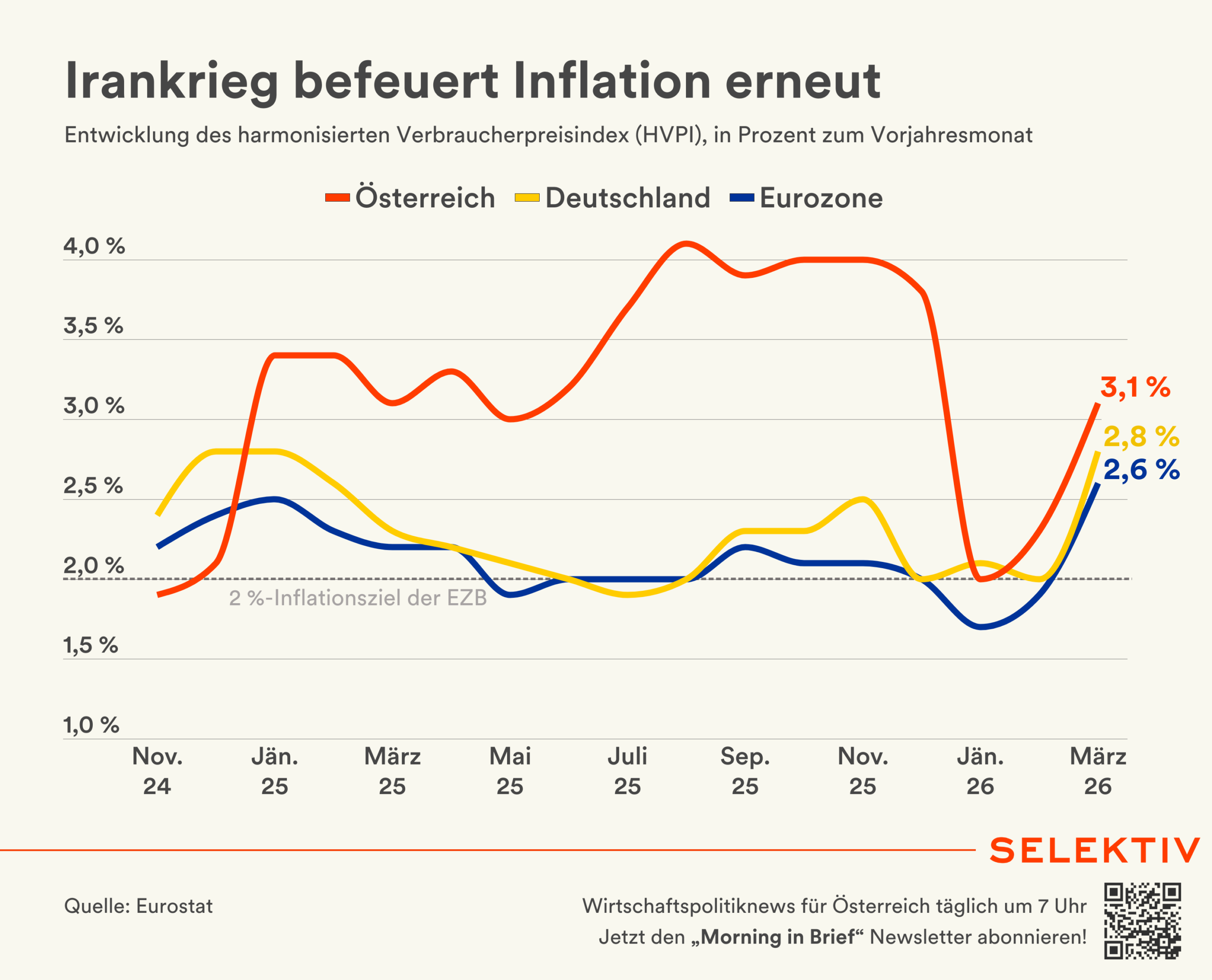 🇦🇹 Inflation im März höher als erwartet. Mit 3,2 % lag die heimische Inflation (VPI) im März um 0,1 Prozentpunkte höher als in der Schnellschätzung erwartet wurde. „Der Anstieg um einen ganzen Prozentpunkt gegenüber dem Vormonat ist nahezu vollständig auf die stark gestiegenen Treibstoff- (+17,5 %) und Heizölpreise (+38,2 %) zurückzuführen“, so Statistik-Austria-Generaldirektorin Manuela Lenk. Ohne diesen Preisanstieg läge die Inflation bei 2,3 %. Wichtigster Inflationstreiber blieben die überdurchschnittlich gestiegenen Preise für Dienstleistungen (+4,5 %). Der für den europäischen Vergleich relevante HVPI lag im März bei 3,1 %. Die Preise stiegen damit stärker als im Eurozonen- (2,6 %) sowie EU-Durchschnitt (2,8 %). Die niedrigste Inflationsrate innerhalb der EU wurde in Dänemark verzeichnet (1,0 %), die höchste in Rumänien (9,0 %). [Quellen: Statistik Austria, Eurostat | Reaktionen: ÖVP, SPÖ, Neos, FPÖ, ÖGB | Grafik: Irankrieg befeuert Inflation erneut]