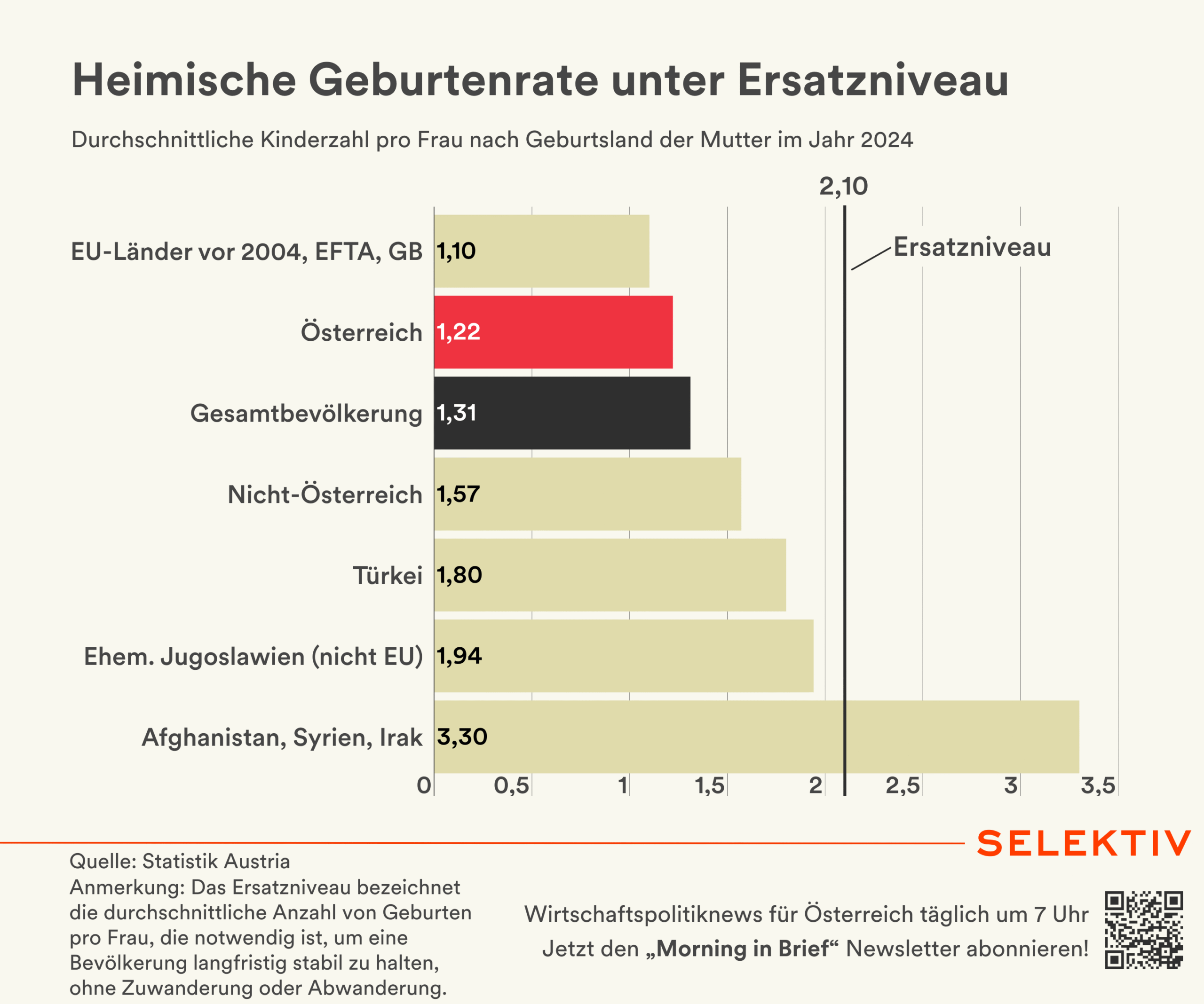 Grafik (von Christoph Hofer): Die durchschnittliche Kinderzahl pro Frau ist 2024 auf ein Allzeit-Tief gesunken. Mit 1,31 Kindern pro Frau lag die Geburtenrate in der Gesamtbevölkerung deutlich unter dem Ersatzniveau von 2,10 Kindern pro Frau, das für eine stabile Bevölkerungsentwicklung ohne Zuwanderung erforderlich ist. Unter den Ländern der EU vor 2004, den EFTA-Staaten und Großbritannien war die Geburtenrate mit 1,10 Kindern pro Frau am niedrigsten. Frauen, die in Österreich geboren wurden, hatten im Durchschnitt 1,22 Kinder, während Frauen mit ausländischer Herkunft auf 1,57 Kinder kamen. Die höchsten Geburtenraten verzeichneten Frauen aus der Türkei (1,80 Kinder), dem ehemaligen Jugoslawien außerhalb der EU (1,94 Kinder) sowie aus Afghanistan, Syrien und dem Irak (3,30 Kinder). [Quelle: Migrationsbericht 2025]