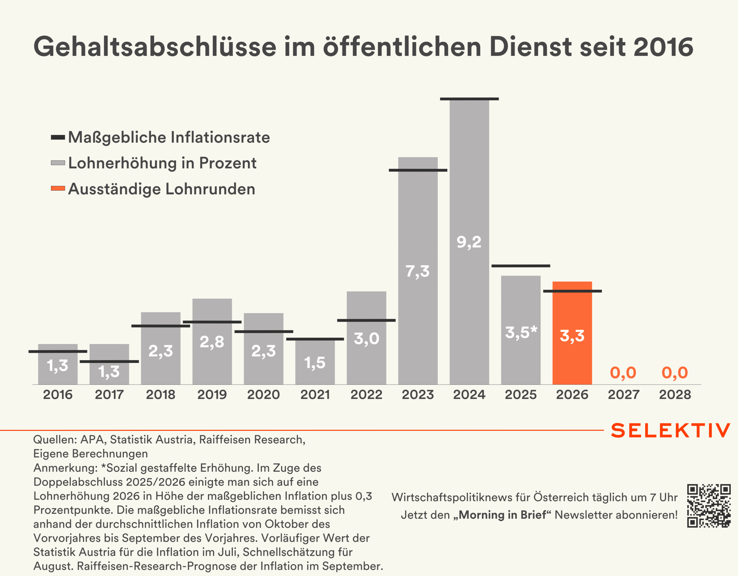 🇦🇹 Erstes Abtasten bei Beamtengehältern. Bei der ersten Gesprächsrunde zu den Gehaltsverhandlungen im öffentlichen Dienst gab es keine Einigung. Das Gespräch wurde von den Teilnehmern als „sehr gut und offen“ sowie „konstruktiv“ beschrieben. Die Gewerkschaft GÖD will in ihren Gremien nun bis Ende nächster Woche entscheiden, ob man in weitere Verhandlungen mit der Bundesregierung eintreten wird, um den bereits vereinbarten Abschluss von rund 3,3 % für 2026 wieder aufzuschnüren. [Quelle: Medienberichte | Grafik: Gehaltsabschlüsse im öffentlichen Dienst seit 2016]