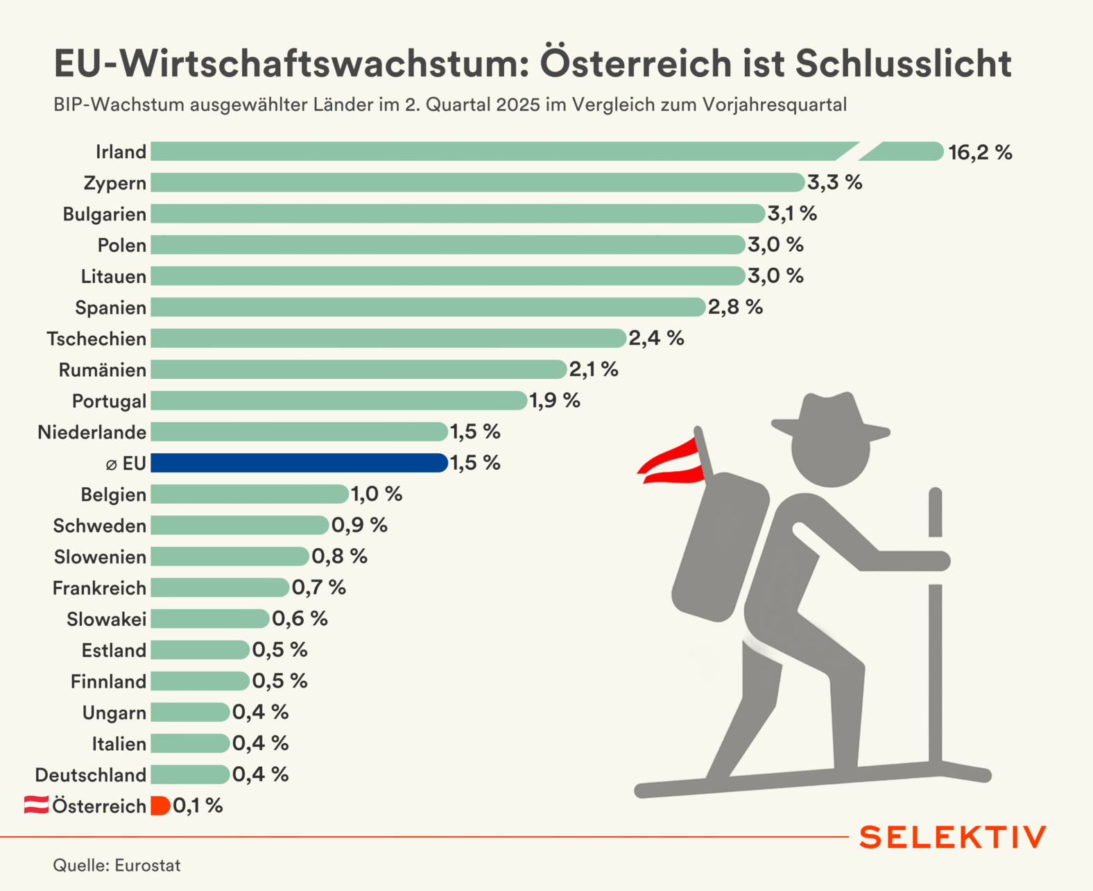 Grafik (von Stephan Frank): Österreich liegt beim Wirtschaftswachstum im 2. Quartal EU-weit an letzter Stelle. Gegenüber dem 2. Quartal 2024 ist die österreichische Wirtschaft im 2. Quartal 2025 nur um 0,1 % gewachsen. Auch gegenüber dem 1. Quartal 2025 gab es nur ein Plus von 0,1 %. Im Schnitt ist die EU gegenüber dem Vorjahresquartal um 1,5 %, der Euroraum um 1,4 % gewachsen. Spitzenreiter ist Irland mit einem deutlichen Wachstum von 16,2 % – vor allem aufgrund vorgezogener Pharma-Exporte in die USA. [Quelle: Eurostat]