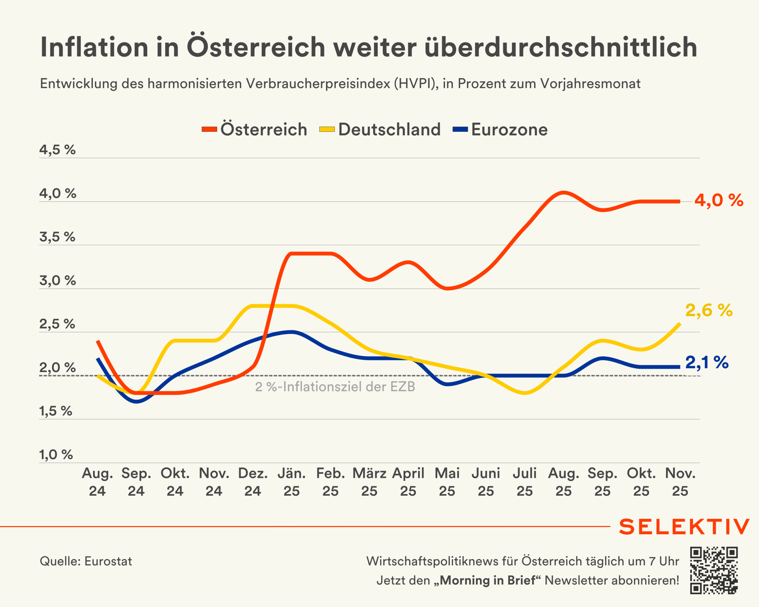 🇦🇹 Inflation in Österreich weiterhin deutlich über Eurozonen-Niveau. Die Verbraucherpreise in Österreich lagen im November im Jahresvergleich um 4,0 % höher und stiegen gegenüber Oktober um 0,3 %. Als stärkste Preistreiber nannte Statistik Austria weiterhin Haushaltsenergie und Dienstleistungen. Im EU-Vergleich weisen nur Kroatien, Estland und Rumänien höhere Inflationsraten auf. In der Eurozone lag die durchschnittliche Inflation bei 2,1 %, in der EU bei 2,4 %. [Quellen: Statistik Austria, Eurostat | Grafik: Inflationsentwicklung in Österreich]