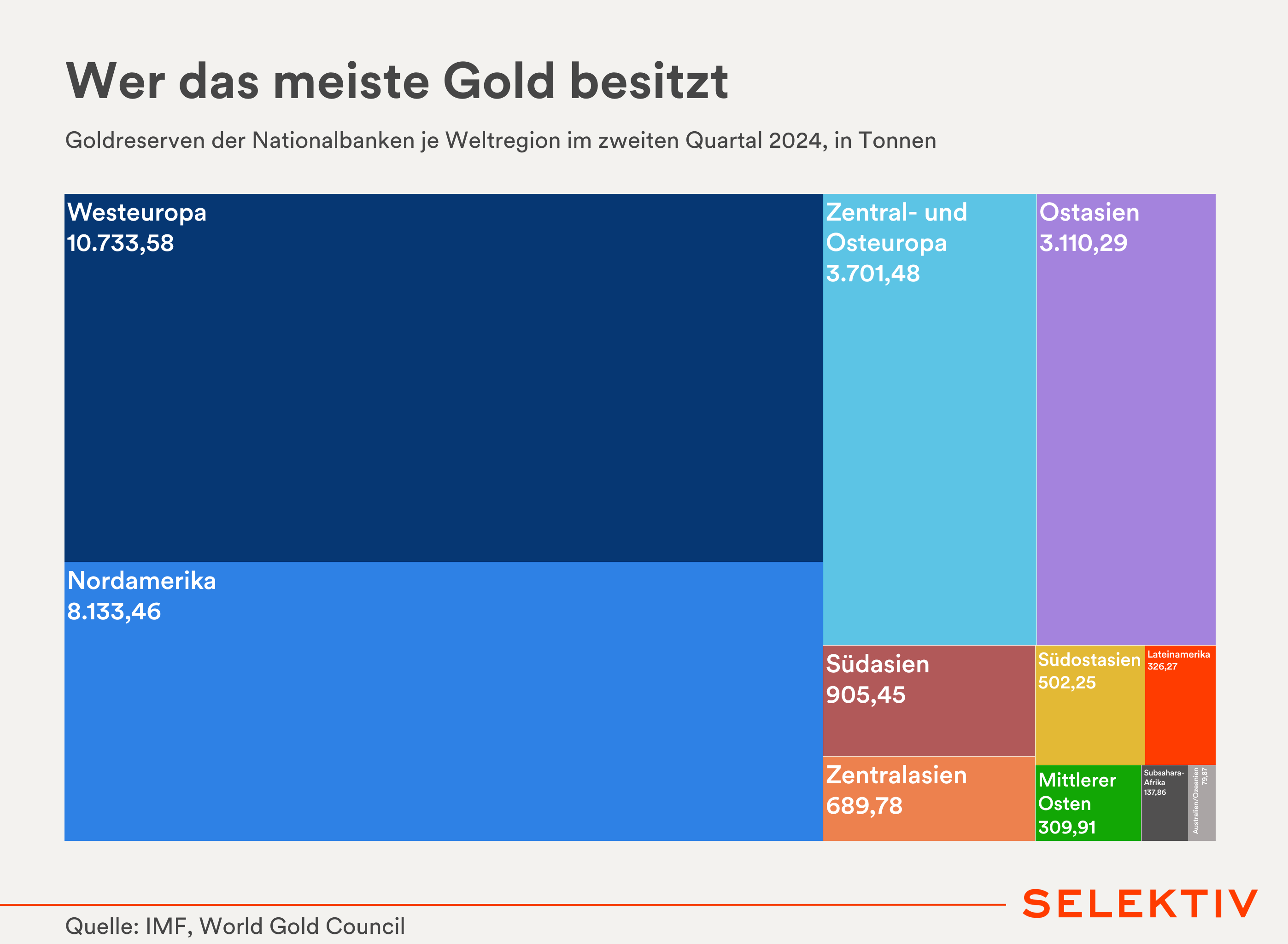 Grafik: Knapp zwei Drittel der von Nationalbanken gehaltenen Goldreserven befinden sich in Westeuropa und Nordamerika. China (2.264 t) und Russland (2.336 t) halten die größten Goldmengen in Osteuropa und Asien. Vor allem Westeuropa verkaufte Gold in den letzten Jahrzehnten. 2000 stellte man noch mehr als die Hälfte der weltweiten Reserven.