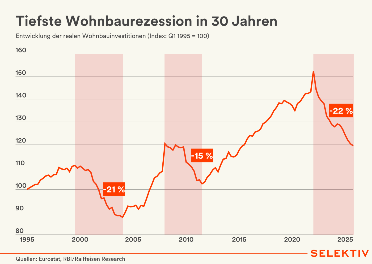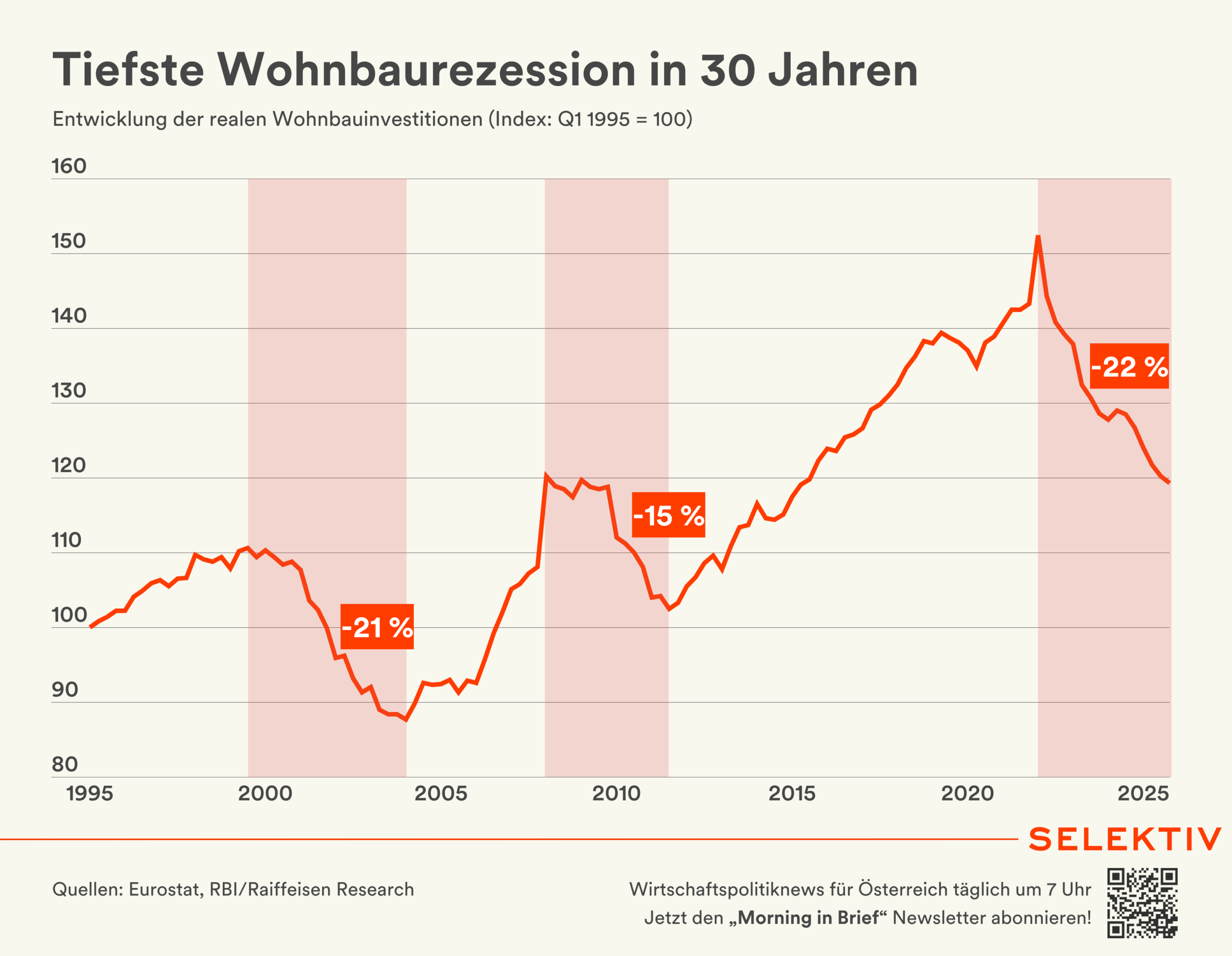 💡 Wohnbausektor verzeichnet Rekordrezession. Mit einem Minus von 21,7 % vom 1. Quartal 2022 bis zum 4. Quartal 2025 muss der heimische Wohnbausektor die tiefste Rezession in 30 Jahren hinnehmen. Zuletzt gab es rund um die Jahrtausendwende einen vergleichbaren Rückgang (-20,7 %). „Die österreichische Wohnbaurezession sucht europaweit fast ihresgleichen. Auch 2026 dürfte für den Wohnbausektor ein Rezessionsjahr sein, Bauzäune und Kräne haben im Landschafts- und Stadtbild mittlerweile Seltenheitswert“, so Raiffeisen-Research-Ökonom Matthias Reith. [Quelle: RBI/Raiffeisen Research | Grafik von Christoph Hofer]
