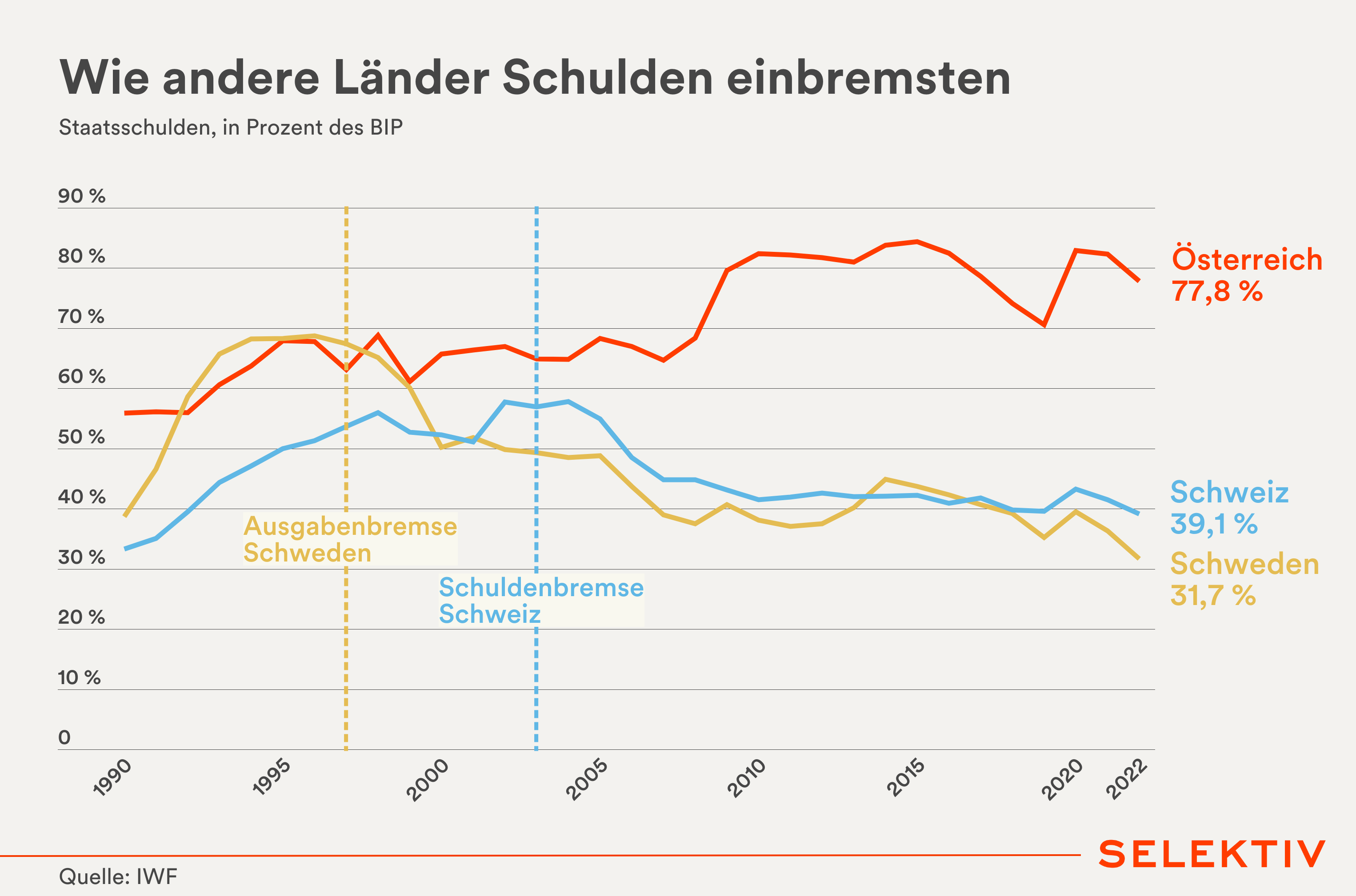Grafik: Schweden und die Schweiz haben eine knapp halb so hohe Staatsverschuldung wie Österreich. Doch das war nicht immer so. Nach harten Debatten in den 90er- bzw. 2000er-Jahren führten beide Staaten Ausgaben- bzw. Schuldenbremsen ein. Regierungen sind seitdem an die Einhaltung eines ausgeglichenen Staatshaushalts gebunden.