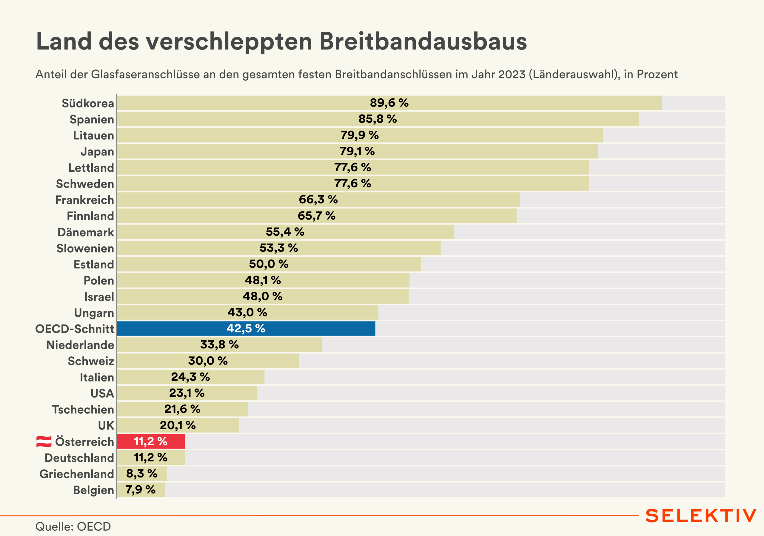 🇦🇹 Telekombranche fordert Förderungen. Die Industriellenvereinigung und Vertreter der Telekommunikationsbranche drängen auf einen „entschlossenen Digitalisierungsschub“. Unter anderem wird ein verpflichtender digitaler Tiefbauatlas gefordert, um die Planbarkeit zu verbessern und Doppelgleisigkeiten zu verhindern. Weiters müsse die Nachfrage nach Glasfaser gefördert werden, da zwar tausende Kilometer Glasfaserkabel verlegt worden wären, aber nur ein Fünftel davon auch zu Haushalten führt. „Nachdem Milliarden öffentlicher Gelder in den Bau der Glasfaser geflossen sind, würde nun die Förderung der Nachfrage Sinn machen“, so Magenta-CEO Thomas Kicker. [Quelle: IV | Grafik: Land des verschleppten Breitbandausbaus]