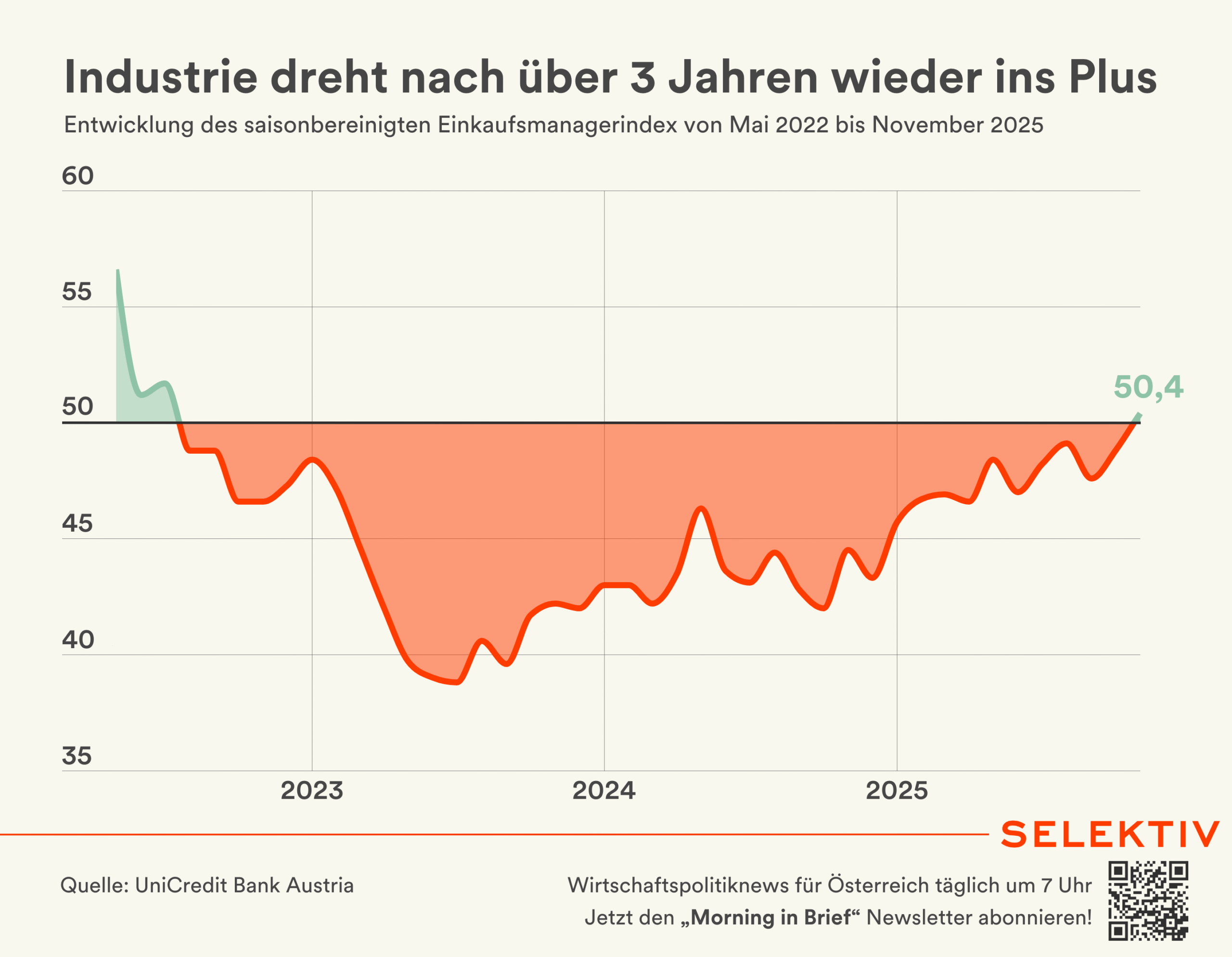 🇪🇺 Industriestimmung im Euroraum eingetrübt. Das Geschäftsklima in der Industrie in der Eurozone verschlechterte sich im November leicht. Mit 49,6 Punkten (-0,4 Zähler) rutschte der Einkaufsmanagerindex von S&P Global knapp unter die Wachstumsschwelle von 50,0 Punkten und damit auf den niedrigsten Stand seit Juni. Zwar signalisierten Österreich (50,4 Punkte) und 5 weitere Länder Wachstum, doch es waren „ausgerechnet die beiden größten Volkswirtschaften, deren Industrie im November noch tiefer in die Rezession gerutscht ist“, so Cyrus de la Rubia, Chefökonom der Hamburg Commercial Bank. Sowohl Deutschland (48,2 Punkte) als auch Frankreich (47,8 Punkte) konnten im vergangenen Monat nämlich keine Geschäftszuwächse verzeichnen. „Die Schwelle zur Expansion zu überspringen, scheint der deutschen Industrie verwehrt zu sein“, resümiert de la Rubia. [Quellen: S&P Global – Eurozone, Deutschland | Grafik: Industrie dreht nach über 3 Jahren wieder ins Plus]