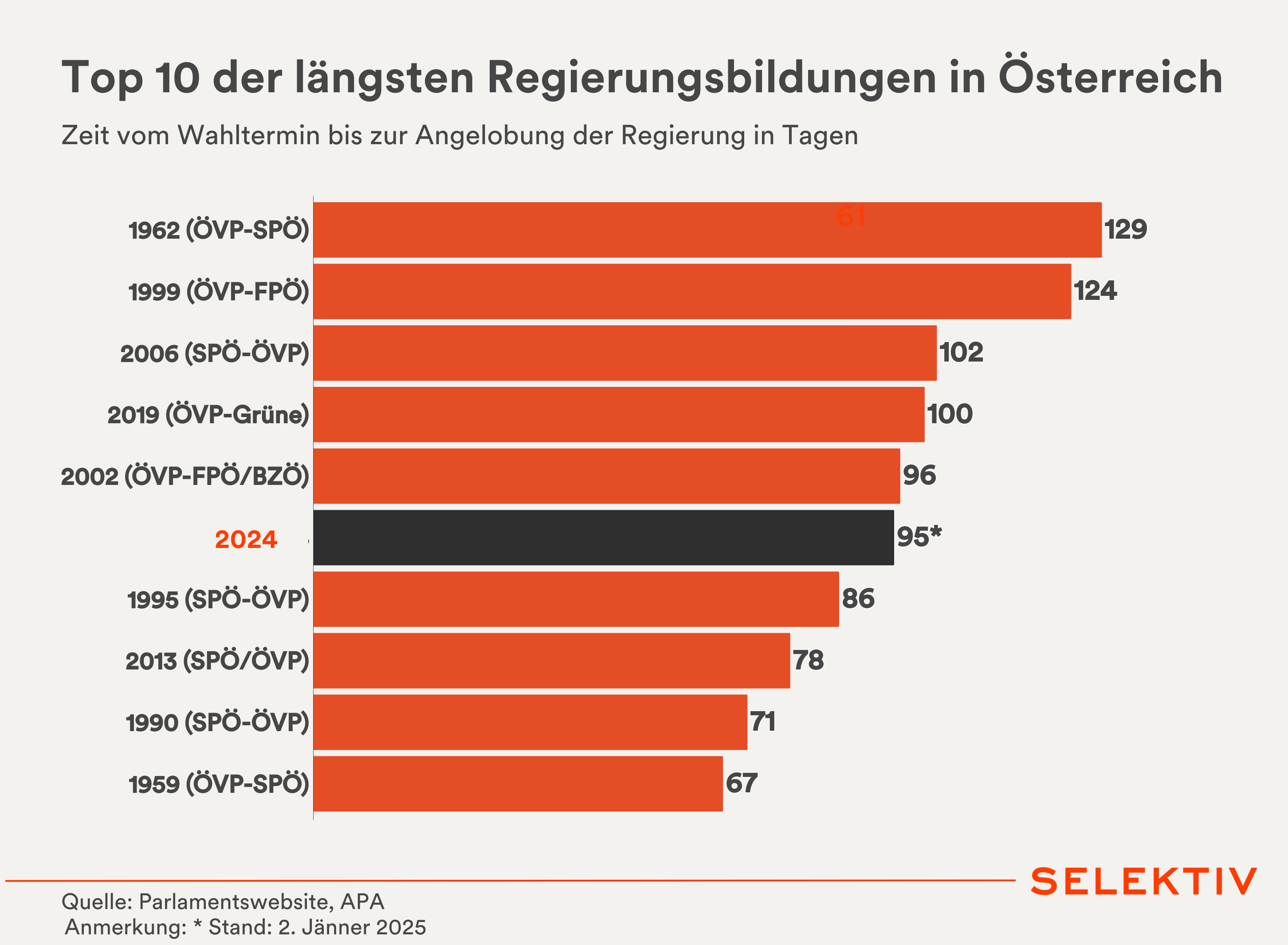 Grafik (von Sara Grasel): Heute treffen sich wieder die Parteichefs von ÖVP, SPÖ und Neos zu weiteren Gesprächen im Rahmen der Regierungsverhandlungen. Knackpunkt ist derzeit das Doppelbudget 2025/2026 und die Frage der Budgetsanierung. Bis Mitte Jänner muss ein Sanierungsplan an die EU-Kommission geschickt werden. Heute sind bereits 95 Tage seit dem Wahltag vergangen – bis zur Angelobung der ÖVP-Grünen-Regierung 2019 vergingen nach der Wahl 100 Tage, am längsten dauerte es 1962 mit 129 Tagen.