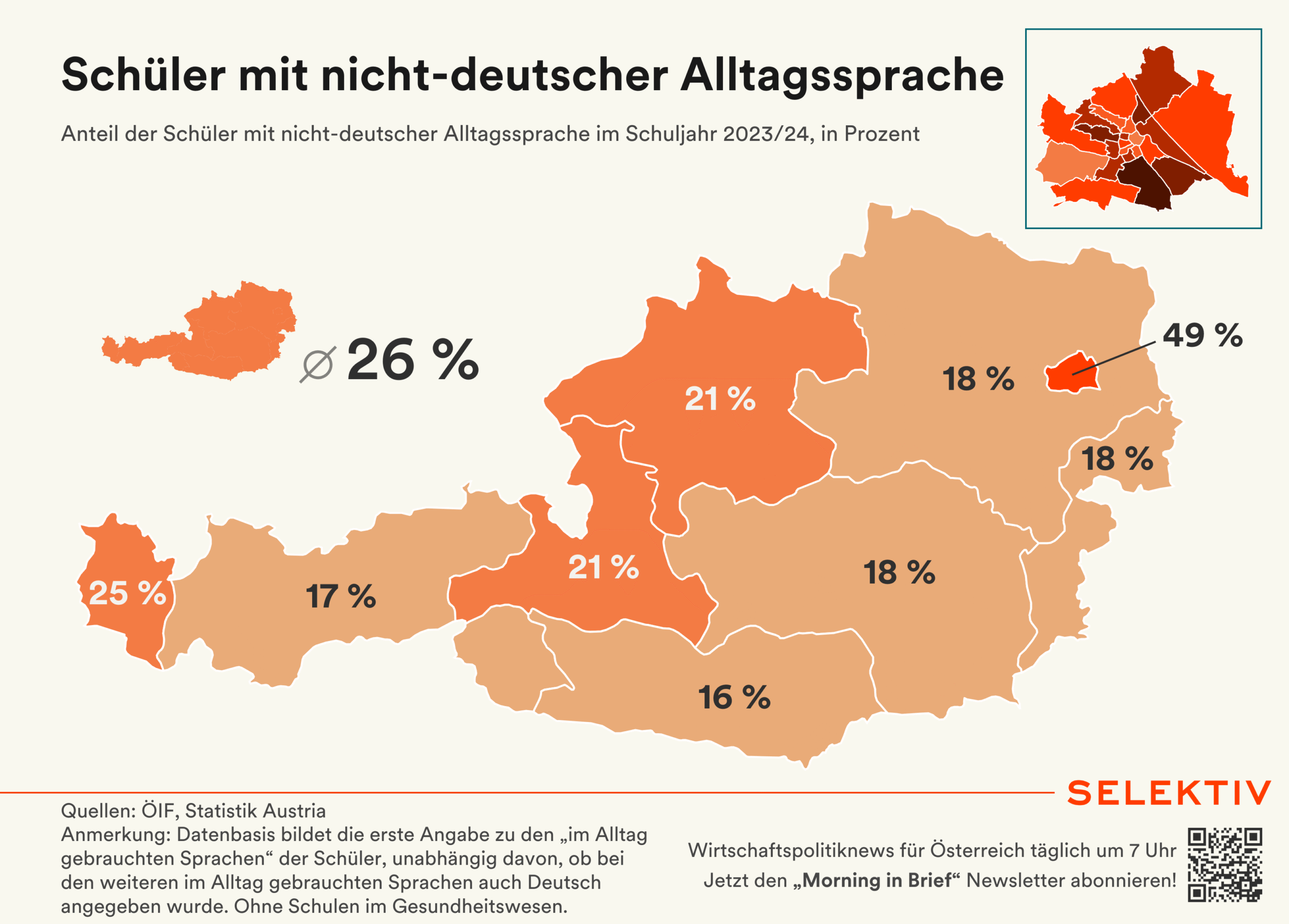 Grafik (von Christoph Hofer): Im Schuljahr 2023/24 hatten rund 26 % der Schüler in Österreich eine nicht-deutsche Alltagssprache, ein Anstieg um 10 Prozentpunkte gegenüber dem Schuljahr 2006/07 (16 %). Wien verzeichnet mit 49 % den höchsten Anteil, Kärnten mit 16 % den niedrigsten. Die häufigsten nicht-deutschen Alltagssprachen sind Bosnisch/Kroatisch/Serbisch (20,6 %), Türkisch (17,9 %), Arabisch (8,8 %) und Rumänisch (7,1 %). In elementaren Bildungseinrichtungen wie Kindergärten und Krippen hatte rund ein Drittel (32,9 %) der Kinder eine nicht-deutsche Alltagssprache. [Quellen: ÖIF, Statistik Austria]