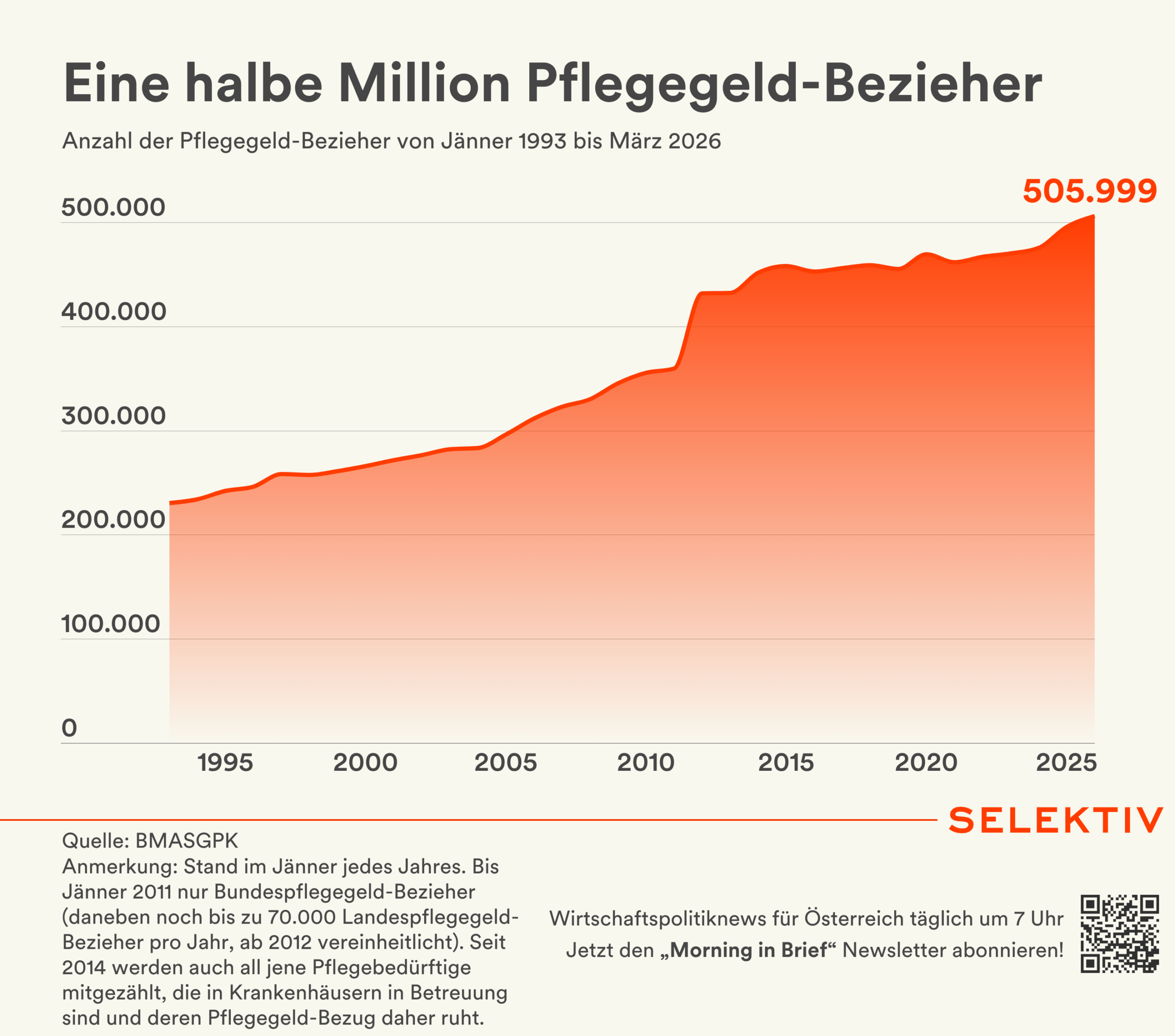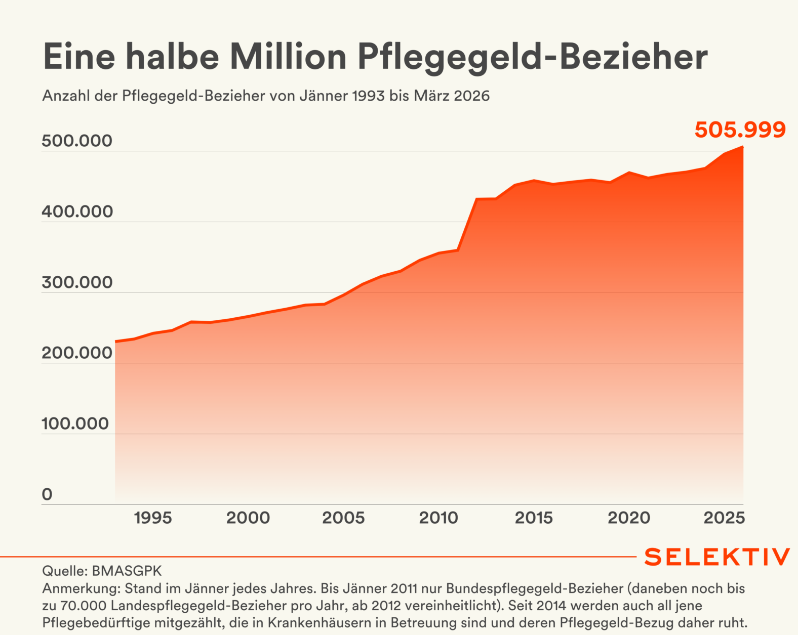 💡 Immer mehr Pflegegeld-Bezieher. Im März bezogen 505.999 Personen in Österreich Pflegegeld – ein Plus von 1,6 % gegenüber dem Vorjahr (498.053). Erstmals wurde die Schwelle von 500.000 Anspruchsberechtigten im Mai 2025 überschritten; seitdem liegt die Zahl beständig darüber. 61 % der Bezieher sind Frauen. Die größte Gruppe entfällt auf Stufe 1 (29,7 %), die kleinste auf Stufe 7 mit dem höchsten Pflegebedarf (1,6 %). Laut einer Prognose des Wifo wird die Zahl der Pflegegeld-Bezieher bis 2050 auf 731.550 steigen. [Quellen: APA via Medienberichte, Pflegevorsorgebericht 2024, Wifo-Prognose | Grafik von Christoph Hofer]