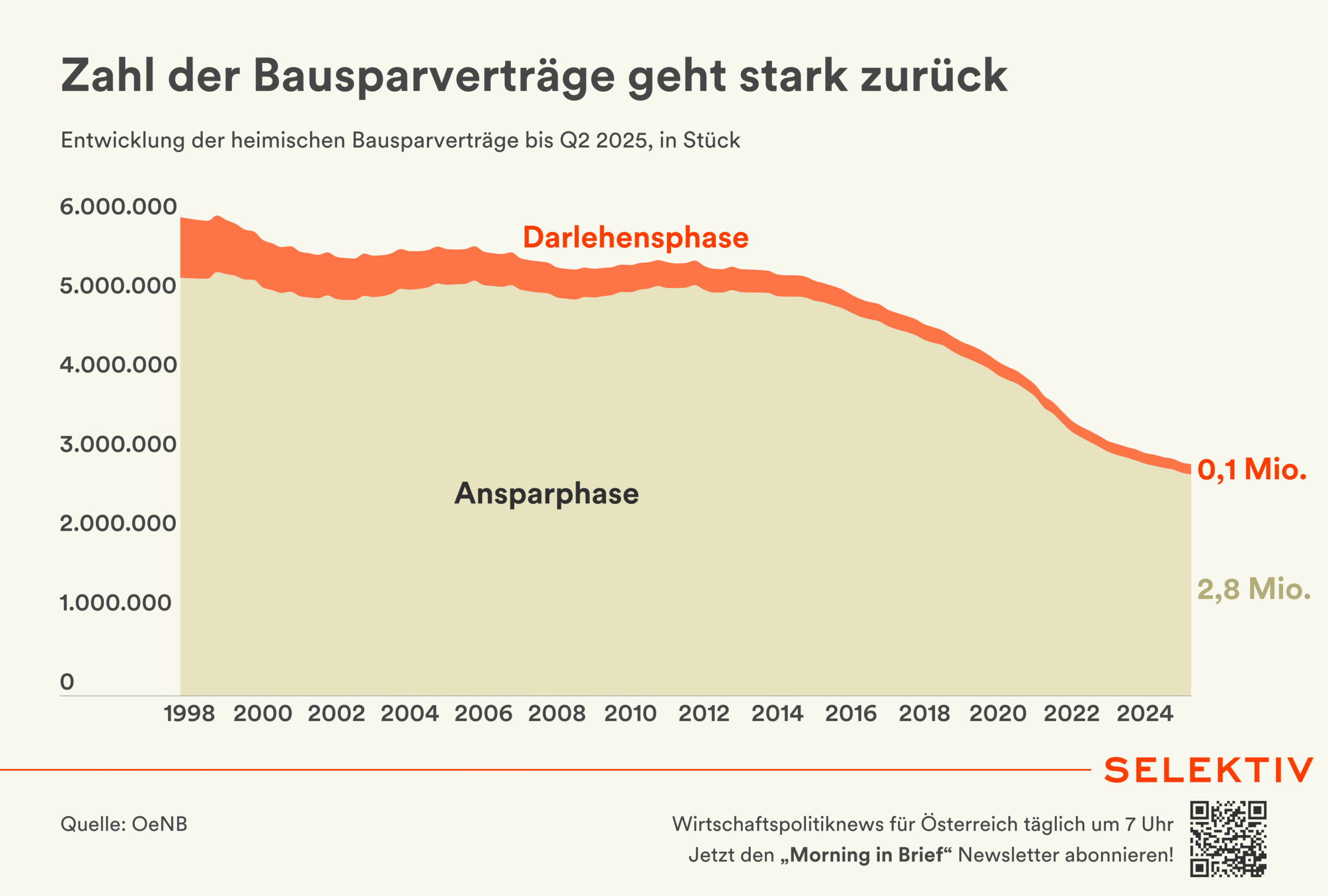 Grafik (von Christoph Hofer): Die Zahl der heimischen Bausparverträge ist im Q2 2025 auf den tiefsten Wert seit 1997 gesunken. Während im Q4 1997 noch rund 6 Mio. Bausparverträge bestanden, waren es im Q2 2025 nur noch rund 2,9 Mio. Parallel dazu schrumpfte das Volumen der Bauspareinlagen im Q2 2025 auf rund 14 Mrd. Euro. Besonders in den letzten zehn Jahren hat sich dieser Rückgang stark beschleunigt. Hauptgründe hierfür sind die seit 2012 auf 1,5 % gesunkene staatliche Bausparprämie, die im Vergleich zu früheren Jahren an Attraktivität verloren hat, sowie die wachsende Konkurrenz durch flexiblere Anlageformen wie Tages- und Festgeldkonten, die oft höhere Renditen bei kürzeren Bindungsfristen bieten. [Quelle: OeNB]