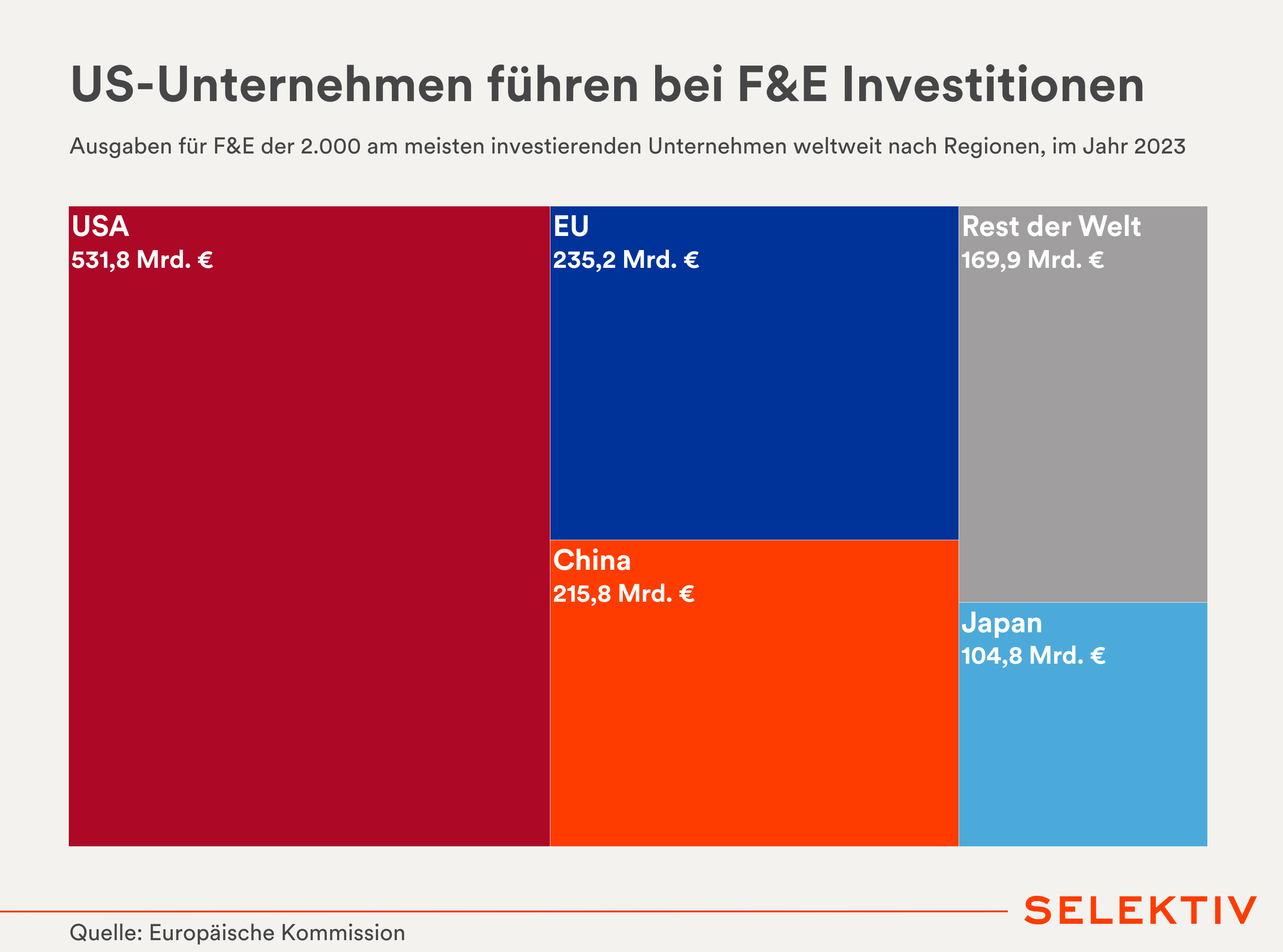 Grafik (von Christoph Hofer): Mehr als eine halbe Billion Euro investierten US-Unternehmen im vergangenen Jahr in Forschung und Entwicklung. Die EU liegt mit 18,7 Prozent der globalen Investitionen auf Platz 2, allerdings weit hinter den USA (42,3 Prozent). China konnte seinen Anteil in den letzten zehn Jahren von 4,5 Prozent (2013) auf 17,1 Prozent (2023) steigern. [Quelle: EU Industrial R&D Investment Scoreboard]