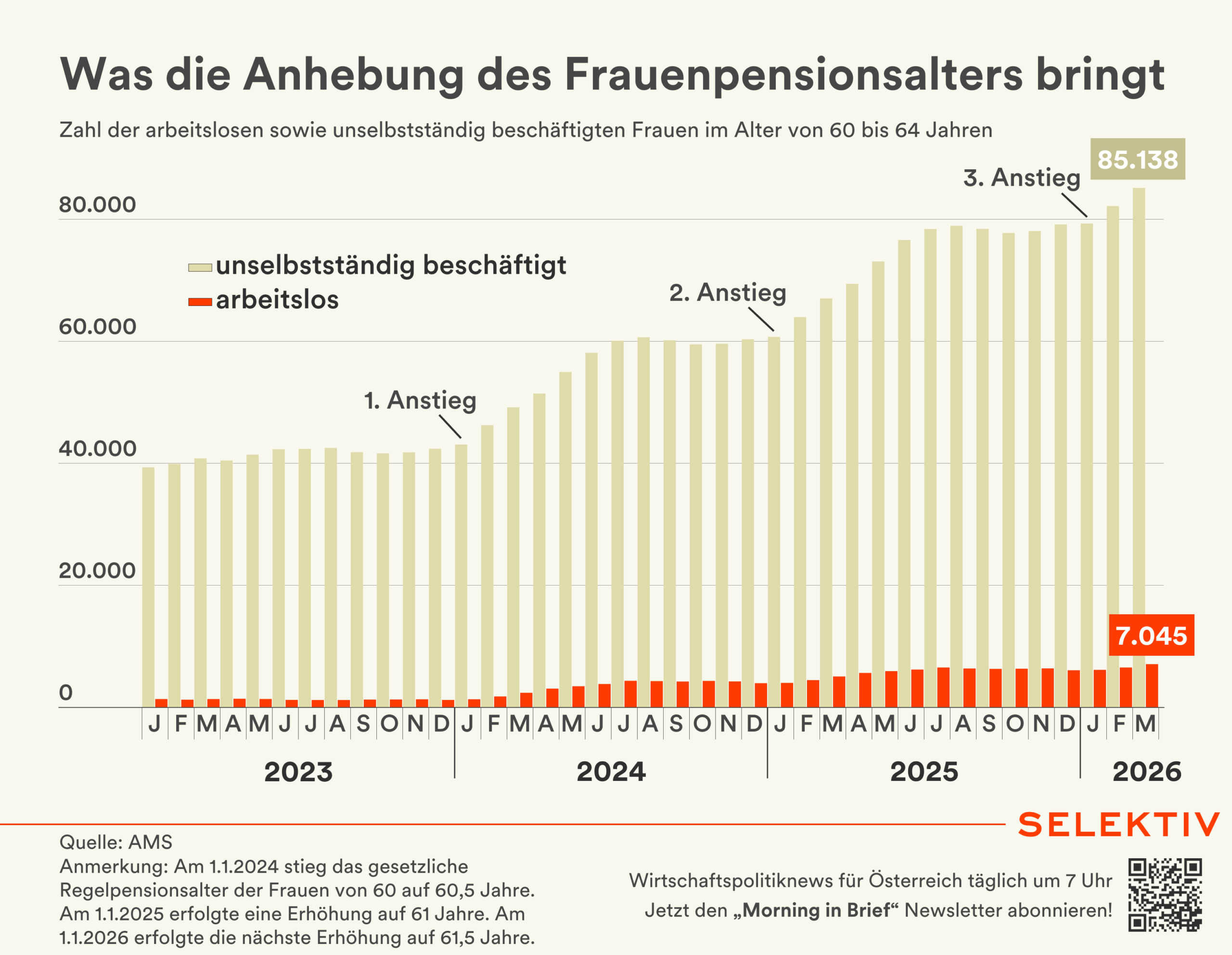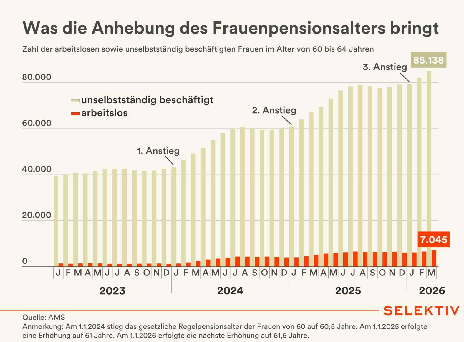 💡 Arbeitslosigkeit steigt – Beschäftigung älterer Frauen wächst stärker. Seit der schrittweisen Anhebung des Frauenpensionsalters ist die Arbeitslosigkeit bei 60- bis 64-jährigen Frauen deutlich gestiegen. Im März 2026 waren 7.045 Frauen dieser Altersgruppe arbeitslos – rund dreieinhalbmal so viele wie Anfang 2024. Gleichzeitig ist die Zahl der unselbstständig beschäftigten Frauen von 60 bis 64 Jahren auf 85.138 geklettert – eine Verdoppelung zum Ausgangswert (Dez. 2023: 42.385). Christine Mayrhuber, Vorsitzende der Alterssicherungskommission bilanziert bei einer Pressekonferenz: „Frauen, die eine Beschäftigung haben, bleiben dabei und verlängern ihre aktive Erwerbstätigkeit.“ Ingrid Korosec (Seniorenbund) und Birgit Gerstorfer (Pensionistenverband) fordern einen „Schulterschluss“ von Arbeitgebern, Arbeitnehmern und Staat. Es brauche ein Umdenken bei Unternehmen in Bezug auf ältere Arbeitskräfte sowie eine Bonus-Malus-Regelung in der Arbeitslosenversicherung für Betriebe, die ältere Mitarbeiterinnen halten oder einstellen. [Quellen: AMS, APA via Medienberichte, Pensionistenverband auf Facebook | Grafik von Christoph Hofer]