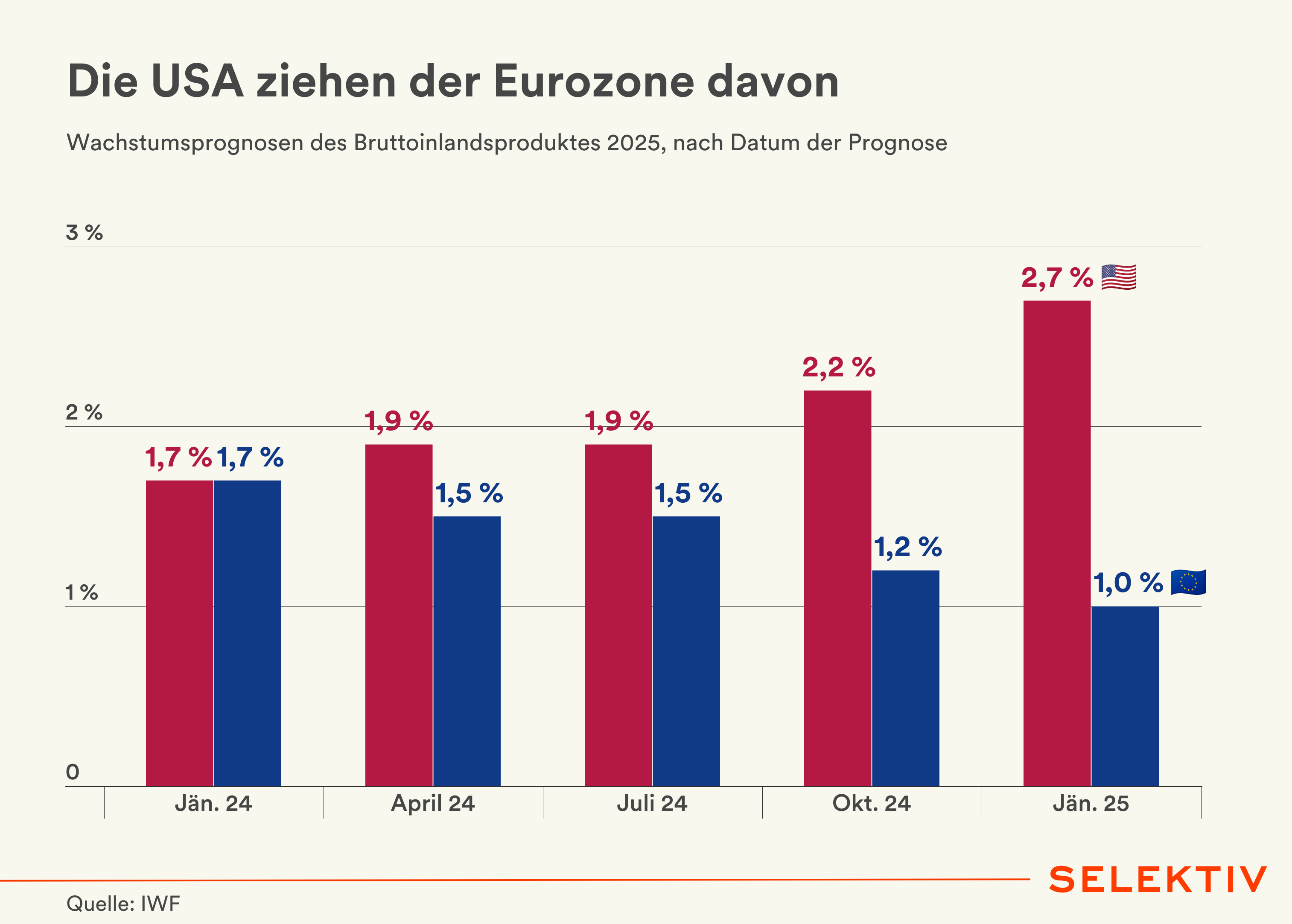 Grafik (von Christoph Hofer): Seit einem Jahr driften die Wachstumsprognosen für die USA bzw. die Eurozone zunehmend auseinander. Noch im Jänner 2024 wurde beiden Wirtschaftsräumen vom Internationalen Währungsfonds (IWF) ein BIP-Wachstum von 1,7 Prozent für das Folgejahr vorausgesagt. Während die USA ihre Wachstumsprognose mittlerweile auf 2,7 Prozent (Jän. 25) steigern konnten, sackte die Eurozone auf 1,0 Prozent ab. Der US-Konjunktur helfen eine robuste Nachfrage, eine weniger restriktive Geldpolitik und steigende Investitionen. Die Wirtschaftsleistung in der Eurozone wurde zuletzt durch eine schwache Dynamik im verarbeitenden Gewerbe und politische Unsicherheiten gedrückt. [Quelle: IWF]