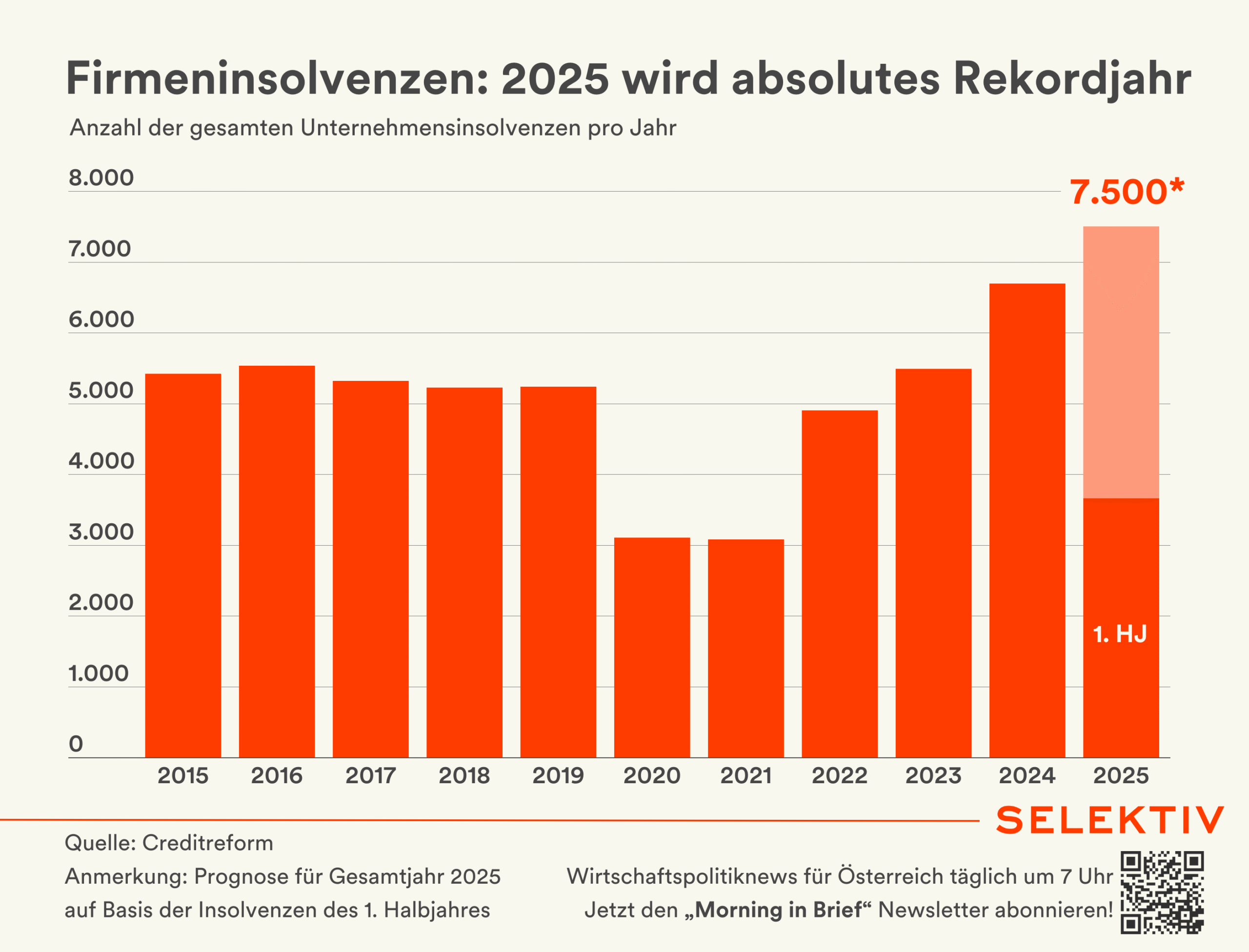 🇦🇹 Unternehmensinsolvenzen in Österreich steigen 2025 um 6 %. Laut ACREDIA und Allianz Trade steigen die Unternehmensinsolvenzen in Österreich 2025 im Vergleich zum Vorjahr um 6 % auf 6.950 Fälle. Besonders betroffen sind Einzelhandel, Bau und Gastronomie. Zudem nimmt der Anteil kleinerer Firmen bei Pleiten zu. Die schwache Wirtschaft Deutschlands, Österreichs wichtigstem Handelspartner, trägt zu diesem Anstieg bei. Deutschland verzeichnet 2025 einen Insolvenzzuwachs von 11 %. Weltweit werden 2025 und 2026 Insolvenzzuwächse von 6 % bzw. 5 % erwartet, bevor 2027 mit einem Rückgang von 1 % gerechnet wird. Die Auswirkungen der US-Zölle werden voraussichtlich erst ab 2026 spürbar. Besonders im Technologie- und KI-Sektor ist das Insolvenzrisiko aufgrund zahlreicher Neugründungen erhöht. [Quelle: ACREDIA | Grafik: Firmeninsolvenzen: 2025 wird absolutes Rekordjahr]