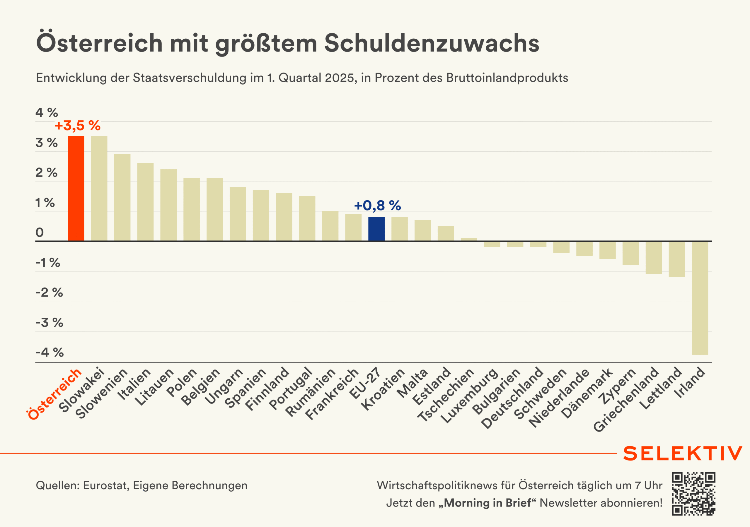 🇪🇺 Staatsschulden steigen. Der öffentliche Schuldenstand ist im 2. Quartal 2025 in der EU auf 81,9 % (Q1: 81,5 %) und im Euroraum auf 88,2 % (Q1: 87,7 %) gestiegen. Österreich liegt mit 82,3 % unter dem Euroraum-Schnitt aber knapp über dem EU-Schnitt. Die höchsten Verschuldungsquoten im Verhältnis zum BIP wurden am Ende des 2. Quartals in Griechenland (151,2 %), Italien (138,3 %) und Frankreich (115,8 %) verzeichnet, die niedrigsten Quoten wurden in Estland (23,2 %), Bulgarien (26,3 %) und Dänemark (29,7 %) registriert. Gegenüber dem Vorquartal konnte Österreich wie 12 andere Mitgliedsstaaten einen Rückgang der Verschuldungsquote verbuchen (-0,8 Prozentpunkte). Verglichen mit dem Vorjahresquartal ist die Schuldenquote jedoch, wie in 16 anderen Mitgliedsstaaten, gestiegen (+0,7 Prozentpunkte). [Quelle: Eurostat | Grafik: Österreich mit größtem Schuldenzuwachs]