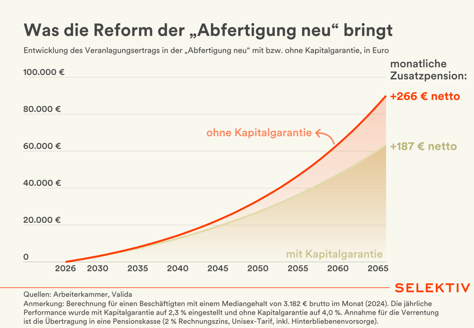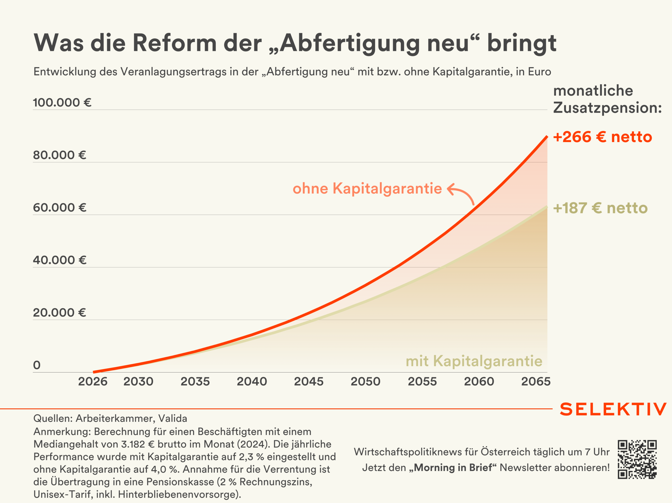 💡 Reform der betrieblichen Vorsorge bringt höhere Zusatzpensionen. Neben der bestehenden „Abfertigung neu“ mit Kapitalgarantie soll über eine gemeinsame Vorsorge-Veranlagungsgesellschaft ab 1.1.2027 die Möglichkeit geschaffen werden, Abfertigungsgelder längerfristig und renditestärker anzulegen. Der Wechsel in das neue Modell ohne Kapitalgarantie ist freiwillig (Opt-in). Mehrere Konten bei verschiedenen Vorsorgekassen (z. B. durch Jobwechsel) werden künftig automatisch zusammengeführt. Zusätzlich schafft ein Generalpensionskassenvertrag die Möglichkeit, angesparte Guthaben aus der „Abfertigung neu“ kostenfrei in eine Pensionskasse zu übertragen und daraus eine lebenslange Zusatzpension zu beziehen. Für einen Beschäftigten mit mittlerem Gehalt würde diese nach 40 Erwerbsjahren rund 266 Euro netto betragen. „Wer das neue System konsequent über das gesamte Erwerbsleben nutzt, erhöht die eigene Nettopension um rund 10 Prozent“, so Neos-Chefin Beate Meinl-Reisinger. [Quellen: Arbeiterkammer, Pressefoyer nach dem Ministerrat, Ministerratsvortrag, Aussendung | Reaktionen: ÖVP, SPÖ, Neos, FPÖ, Grüne, PVÖ, Seniorenbund, JW, VVÖ, ÖGB | Grafik von Christoph Hofer]