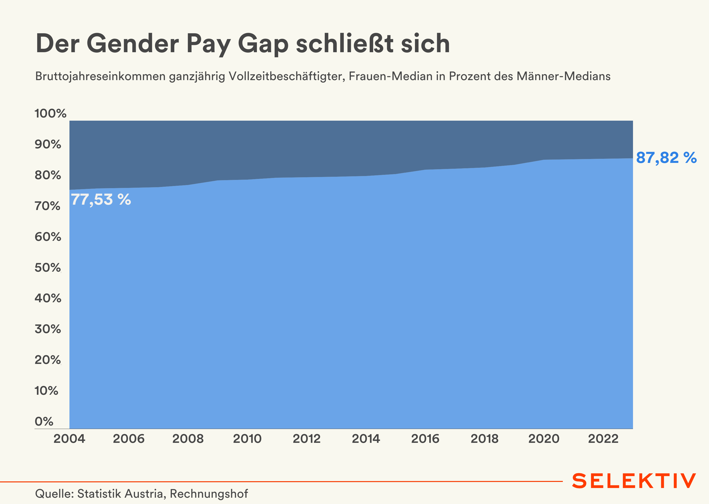 Grafik (von Christoph Hofer): Verdienten ganzjährig vollzeitbeschäftigte Frauen im Jahr 2004 im Mittel 77,53 Prozent des mittleren Männereinkommens, so waren es 2023 bereits 87,82 Prozent. Um rund zehn Prozentpunkte nahm der Einkommensunterschied zwischen den Geschlechtern ab. Ausgehend vom Basisjahr 2004 wuchs zudem das mittlere Bruttojahreseinkommen aller ganzjährig Vollzeitbeschäftigten um inflationsbereinigt 5 Prozent (Frauen: plus 15 Prozent). [Quelle: Statistik Austria; Allgemeiner Einkommensbericht 2024]