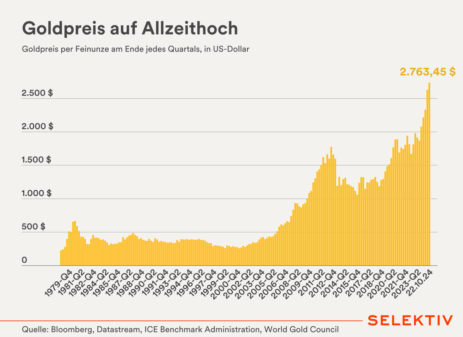 Grafik (von Christoph Hofer): Der Goldpreis erreichte mit über 2.700 US-Dollar je Feinunze vor kurzem ein neues Allzeithoch. Auch inflationsbereinigt wurde zum ersten Mal seit mehr als 40 Jahren ein neuer Höchstpreis verzeichnet. Zurückzuführen ist dies auf einen neuen Nachfrage-Boom für das seltene Edelmetall. Immer mehr Notenbanken halten lieber Gold als US-Staatsanleihen. Und auch private Investoren flüchten nach der erfolgten Zinswende in die inflationsgesicherte Anlageform.