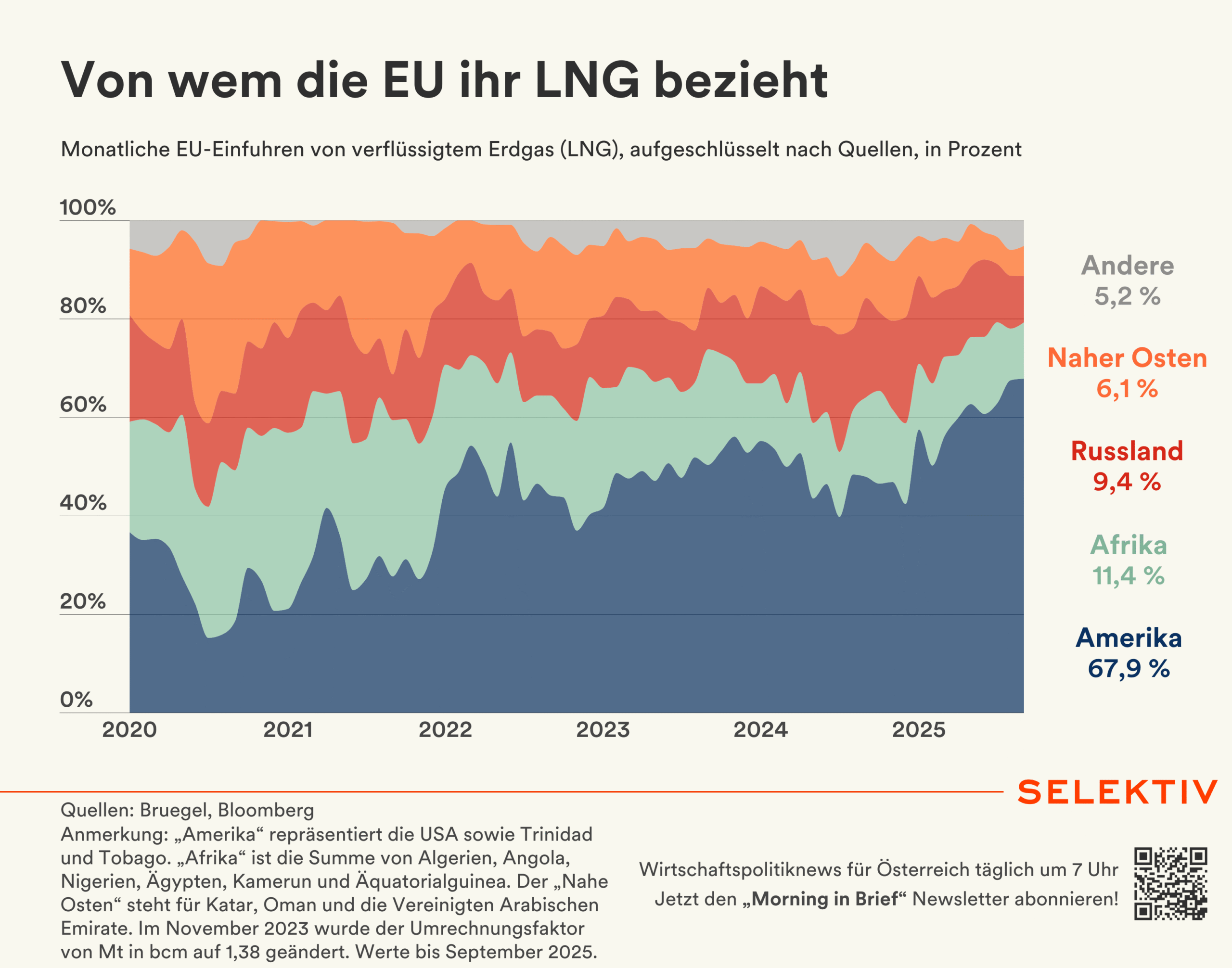 🇪🇺 Katar und USA drohen aufgrund Lieferkettenrichtlinie mit LNG-Stopp. Die Energieminister von Katar und den USA haben in einem offenen Brief festgehalten, dass die Lieferkettenrichtlinie (CSDDD) ein „erhebliches Risiko für die Erschwinglichkeit und Zuverlässigkeit der kritischen Energieversorgung für Haushalte und Unternehmen in ganz Europa“ darstellt. Die Richtlinie würde zu „höheren Energie- und Rohstoffpreisen führen und sich negativ auf Investitionen und Handel auswirken“, so das gemeinsame Statement von Chris Wright und Saad al-Kaabi weiter. Bereits letzte Woche hatte al-Kaabi gegenüber Reuters festgehalten, dass Katar die EU nicht mit LNG versorgen kann, so die CSDDD nicht deutlich aufgeweicht oder ganz abgeschafft wird. Die im Rahmen der Omnibus-Simplifizierungen abgeänderten Entwürfe zu den Nachhaltigkeits- und Lieferkettengesetzen wurde vom Europäischen Parlament gestern knapp abgelehnt, somit muss am 13. November erneut darüber abgestimmt werden. [Quellen: Qatar News Agency, Reuters, EU-Parlament | Reaktionen: SPÖ, ÖVP, ÖGB | Interview: „Sind systematisch dabei, unsere globalen Gasanbieter zu reduzieren“]