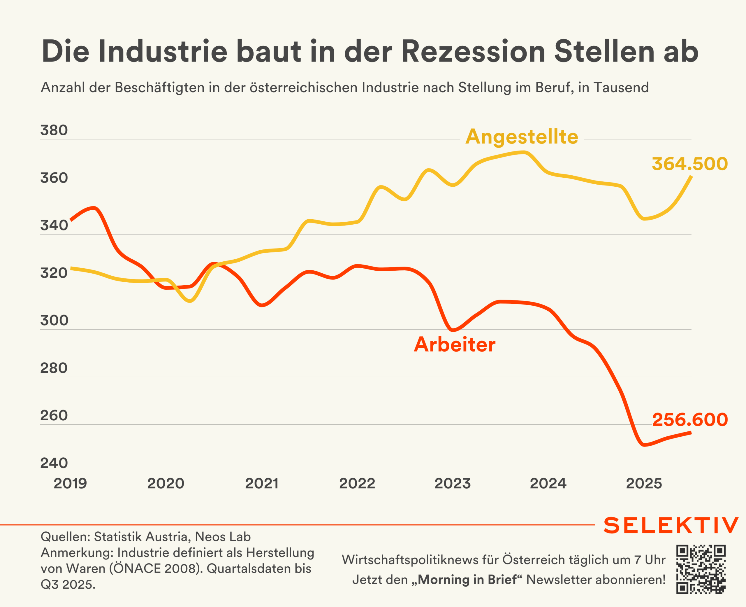 💡 Industrierezession kostete 66.000 Arbeitsplätze. Im 4. Quartal 2022 zählte die Industrie (= Herstellung von Waren) noch rund 687.000 Beschäftigte, bis zum 3. Quartal 2025 sank die Zahl auf rund 621.000. Besonders hart traf es die Industriearbeiter (-63.000). In den ersten drei Quartalen 2025 stabilisierte sich die Beschäftigung leicht und stieg saisonbereinigt marginal – ein erstes Zeichen, dass der Talboden erreicht sein könnte. [Quellen: Statistik Austria, Neos Lab | Grafik von Christoph Hofer]