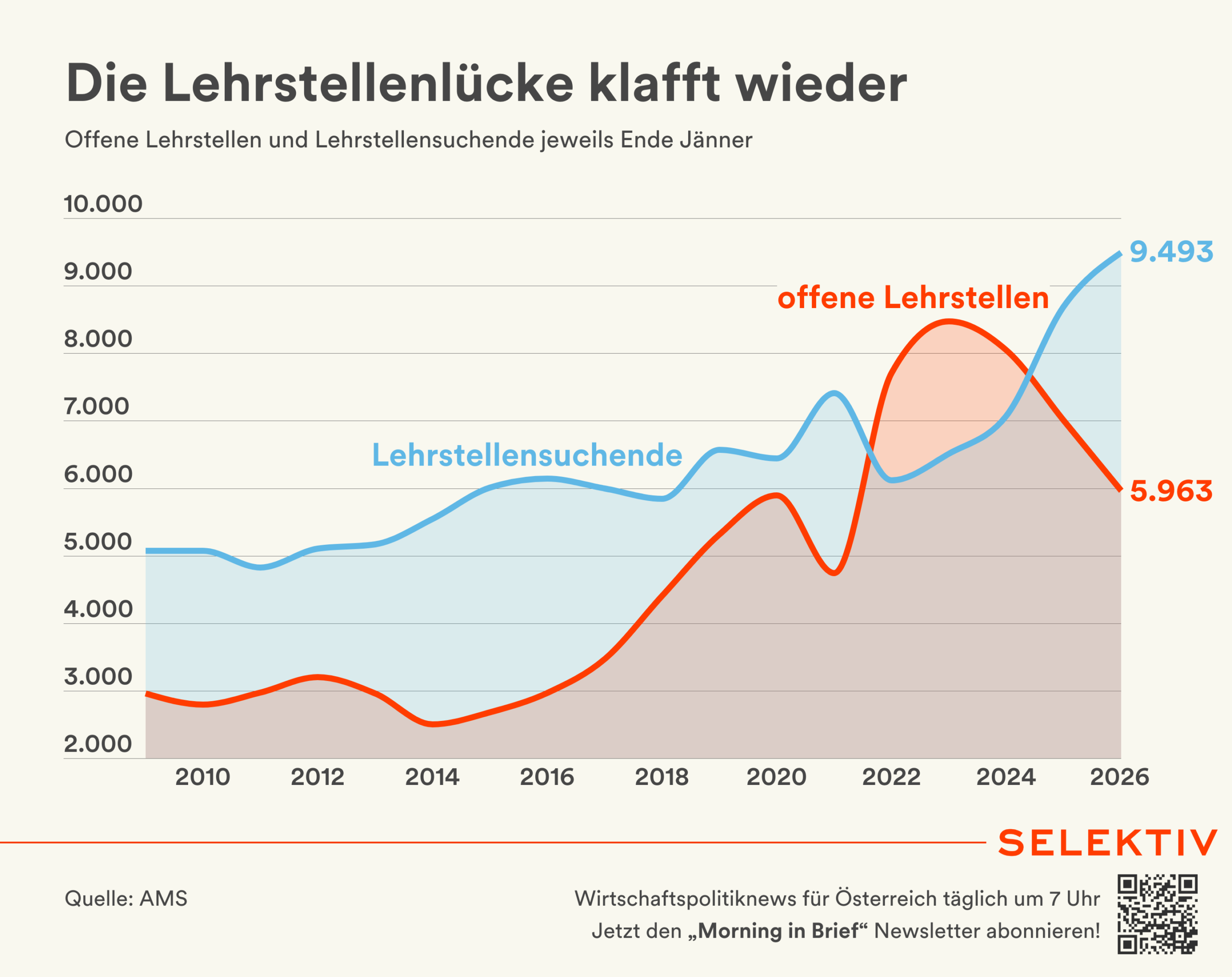 🇦🇹 AK und ÖGB orten „schwaches Interesse an Lehrlingen“. Laut Arbeiterkammer und ÖGB suchen derzeit 24.506 Jugendliche eine Lehrstelle. Eingerechnet sind hier nicht nur alle Lehrstellensuchenden, die beim AMS vorgemerkt sind (9.493), sondern auch Jugendliche in Schulungen (15.013). Demgegenüber standen im Jänner laut AMS 5.963 offene Lehrstellen. Allgemein ist der Arbeitsmarkt derzeit durch Nachzieheffekte der Rezession von einem Anstieg der Arbeitslosigkeit geprägt. AK und ÖGB orten ein „schwaches Interesse der Firmen an Lehrlingen“. So seien vergangenes Jahr um 10.000 neue Lehrlinge weniger aufgenommen worden als noch vor 20 Jahren. Die Industriellenvereinigung verweist in einer Reaktion darauf, dass „die Leistungen der vielen guten Ausbildungsunternehmen“ die Lehre erfolgreich machen. „Dass die Anzahl der Lehrbetriebe zurückgeht – rezessionsbedingt sogar in der Industrie –, ist ein Fakt, dem man gemeinsam entgegenwirken muss“, so die IV. [Quellen: Presseunterlagen, IV | Reaktionen: SPÖ, FPÖ | Grafik: Die Lehrstellenlücke klafft wieder]