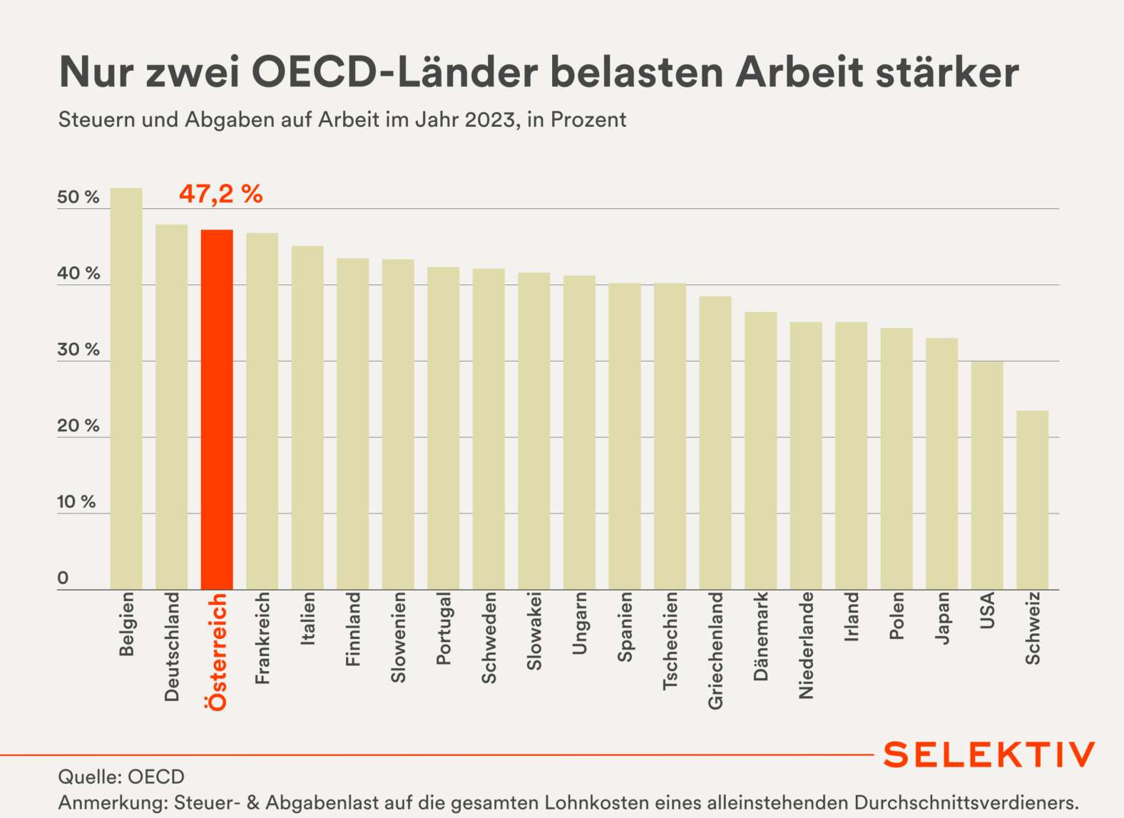 Grafik: Österreich ist bei der Besteuerung von Arbeit im Spitzenfeld der OECD-Mitgliedsländer. Mit einer Steuer- und Abgabenlast von 47,2 Prozent auf die gesamten Lohnkosten, liegt Österreich auf Platz 3 hinter Belgien und Deutschland. Die Schweiz liegt bei unter 25 Prozent.