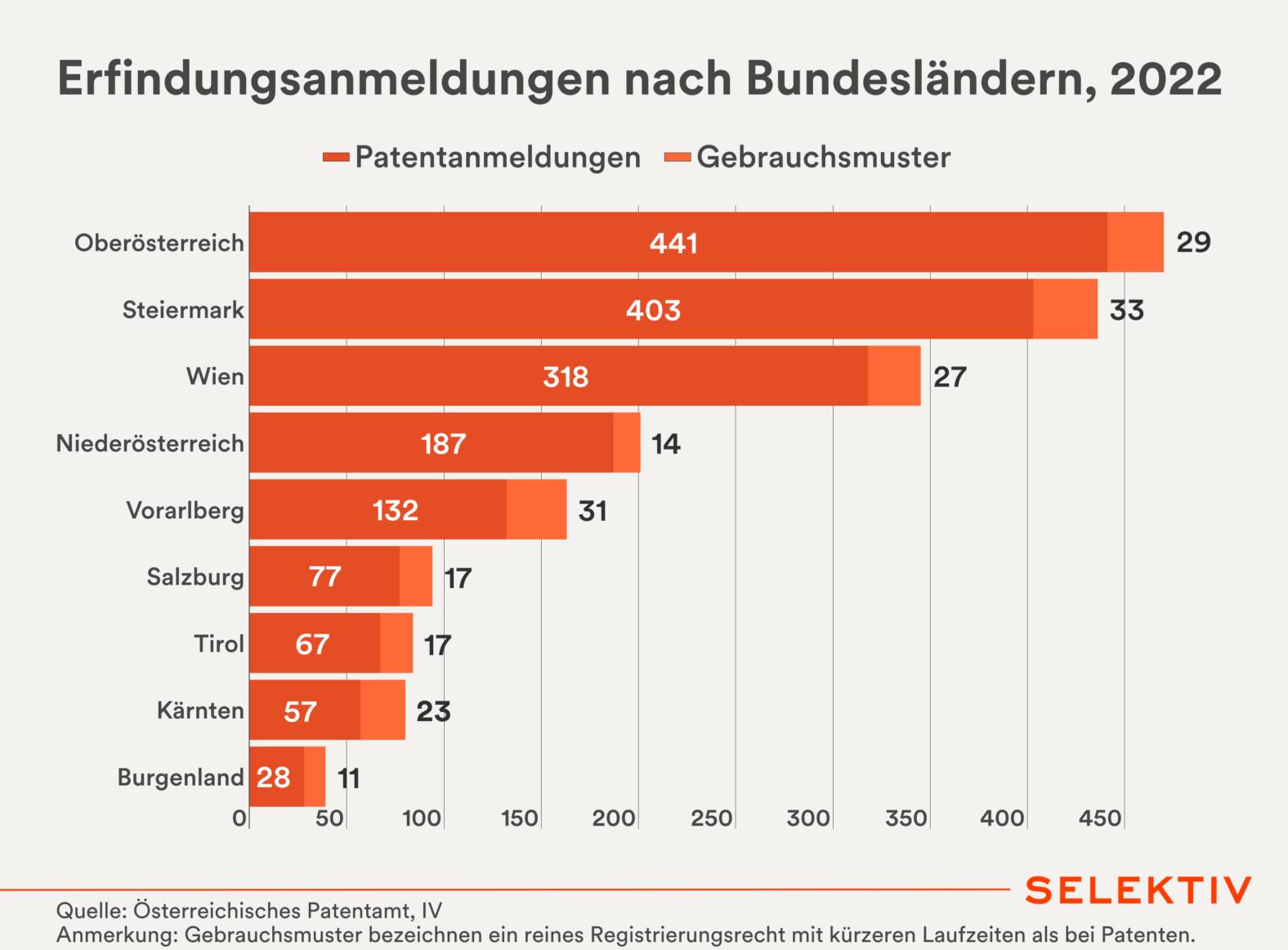 Grafik: Bei den Erfindungsanmeldungen (Patente plus Gebrauchsmuster) in Österreich führen die beiden Industriebundesländer Oberösterreich und Steiermark klar, mit jeweils über 400 Anmeldungen im Jahr 2022. Schon mit etwas Abstand folgt die Bundeshauptstadt Wien. Österreichweit gab es 1.912 Einreichungen (2022).