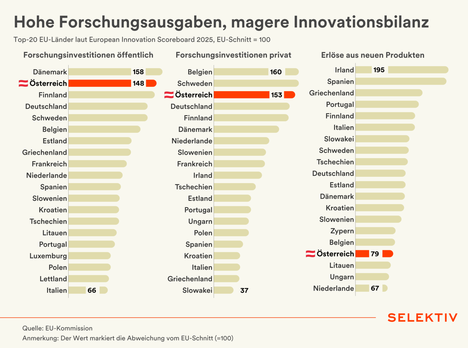 💡 Viel Geld für F&E, aber wenig „Output“. Österreich liegt bei der Innovationsfähigkeit auf Platz 8 im European Innovation Scoreboard, das die Länder anhand verschiedener Indikatoren vergleicht und einen Index mit der Basis des EU-Schnitts bildet. Blickt man in die einzelnen Indikatoren, bestätigt sich der Befund, den der Forschungsrat Forwit seit Jahren beklagt: Österreich investiert sehr viel in Forschung und Entwicklung (Platz 2 bzw. 3), beim „Output“ sind andere Länder aber wesentlich besser. Die Verkaufserlöse, die in Österreich mit neuen Produkten erzielt werden, liegen deutlich unter dem EU-Schnitt. [Quelle: European Innovation Scoreboard 2025 | Grafik von Sara Grasel]