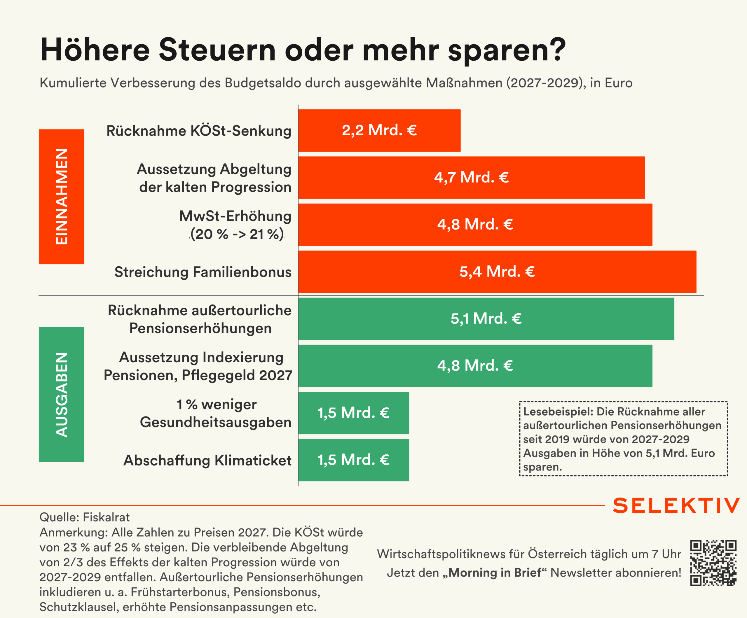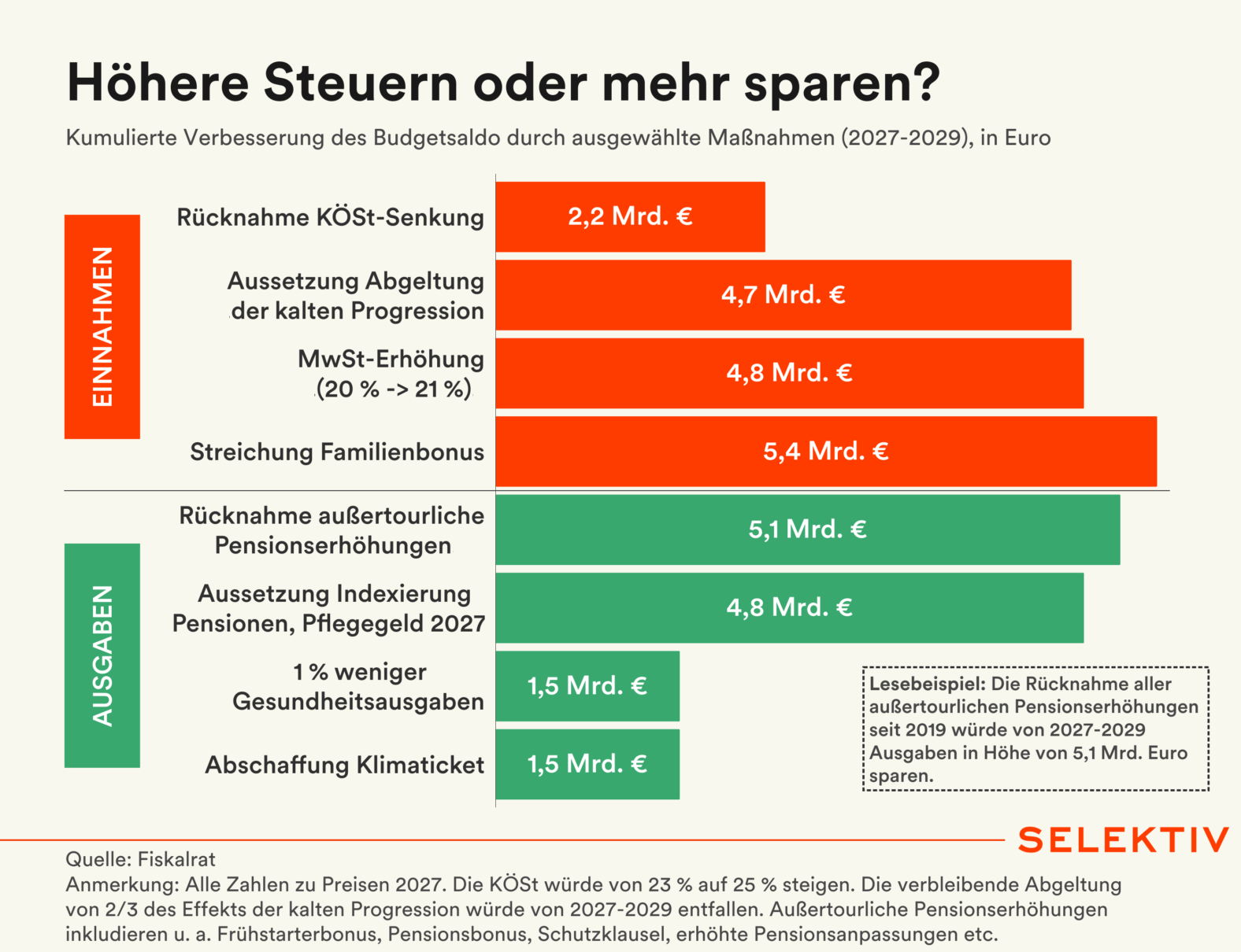 💡 Familienbonus oder Pensionen: Fiskalrat zeigt Konsolidierungsalternativen. Der Fiskalrat hat mögliche Maßnahmen zur Verbesserung des Budgetsaldos 2027-2029 analysiert. Die Streichung des Familienbonus würde 5,4 Mrd. Euro Mehreinnahmen bringen, eine MwSt-Erhöhung von 20 auf 21 % 4,8 Mrd. Euro. Die vollständige Rückkehr der kalten Progression brächte dem Finanzminister 4,7 Mrd. Euro. Bei den Ausgaben spart die Rücknahme außertourlicher Pensionserhöhungen 5,1 Mrd. Euro und die einmalige Aussetzung der Indexierung von Pensionen und Pflegegeld 4,5 Mrd. Euro. Weitere Optionen sind die Abschaffung des Klimatickets oder um 1 % geringere Gesundheitsausgaben (je 1,5 Mrd. Euro). Die Berechnungen dienen als neutrale Diskussionsgrundlage für weitere Konsolidierung. [Quelle: Fiskalrat | Grafik von Christoph Hofer]