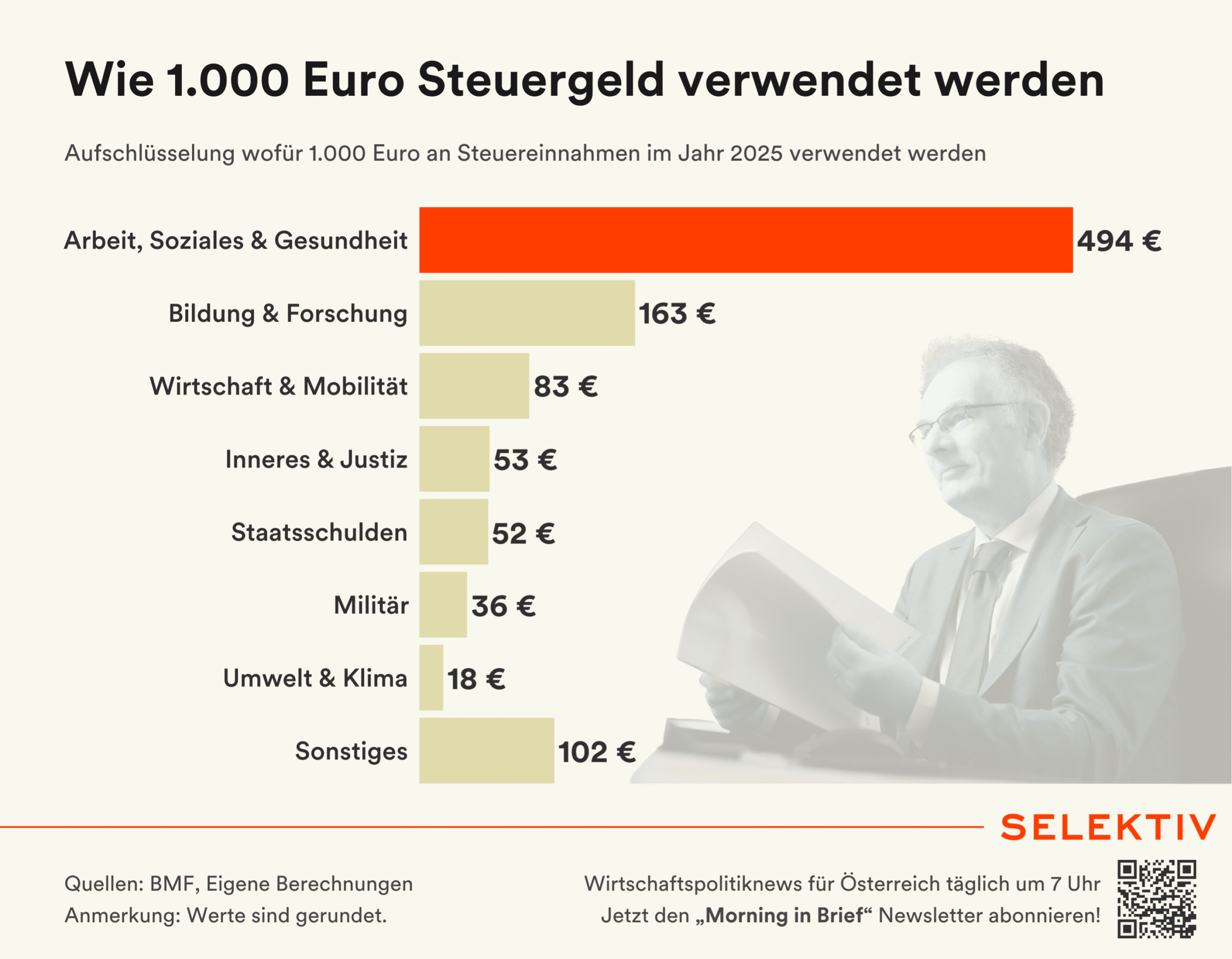 Grafik (von Christoph Hofer): Gemäß dem Budget 2025 entfallen 494 von 1.000 Steuereuros auf die Bereiche Arbeit, Soziales und Gesundheit. Den größten Einzelposten stellen dabei die Pensionen mit 267 Euro dar. Für Bildung und Forschung werden 163 Euro veranschlagt, gefolgt von Wirtschaft und Mobilität mit 83 Euro. Die staatlichen Kernaufgaben Innere Sicherheit und Justiz verursachen Kosten von 53 Euro, während für das Militär 36 Euro aufgewendet wird. Der Zinsdienst für die heimischen Staatsschulden schlägt bereits mit 52 Euro zu Buche. Für Umwelt und Klima werden schließlich 18 Euro ausgegeben. [Quelle: BMF]