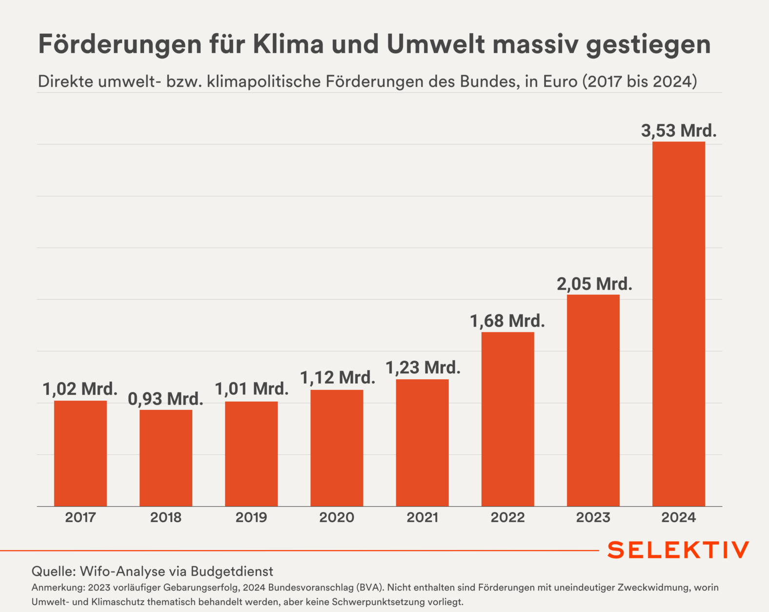 Grafik (von Sara Grasel): Die direkten umwelt- bzw. klimapolitischen Förderungen des Bundes haben sich zwischen 2017 und 2024 mehr als verdreifacht. Ein starker Fokus liegt laut Wifo-Institut auf dem Klimaschutz, während Kreislaufwirtschaft und Biodiversität kaum ins Gewicht fallen. Direkte Förderungen sind in Österreich ein wichtiges Instrument der Klima- und Umweltpolitik. Das Wifo hat sich in einer aktuellen Analyse weitere mögliche Instrumente angesehen – darunter erhöhte Parkgebühren für SUV in Paris, ein Flächenhandelssystem, das als Planspiel in Deutschland versucht wurde, oder ein „Negativemissionsfonds“ für Industrien mit nicht-reduzierbaren Emissionen. [Quelle: Wifo]