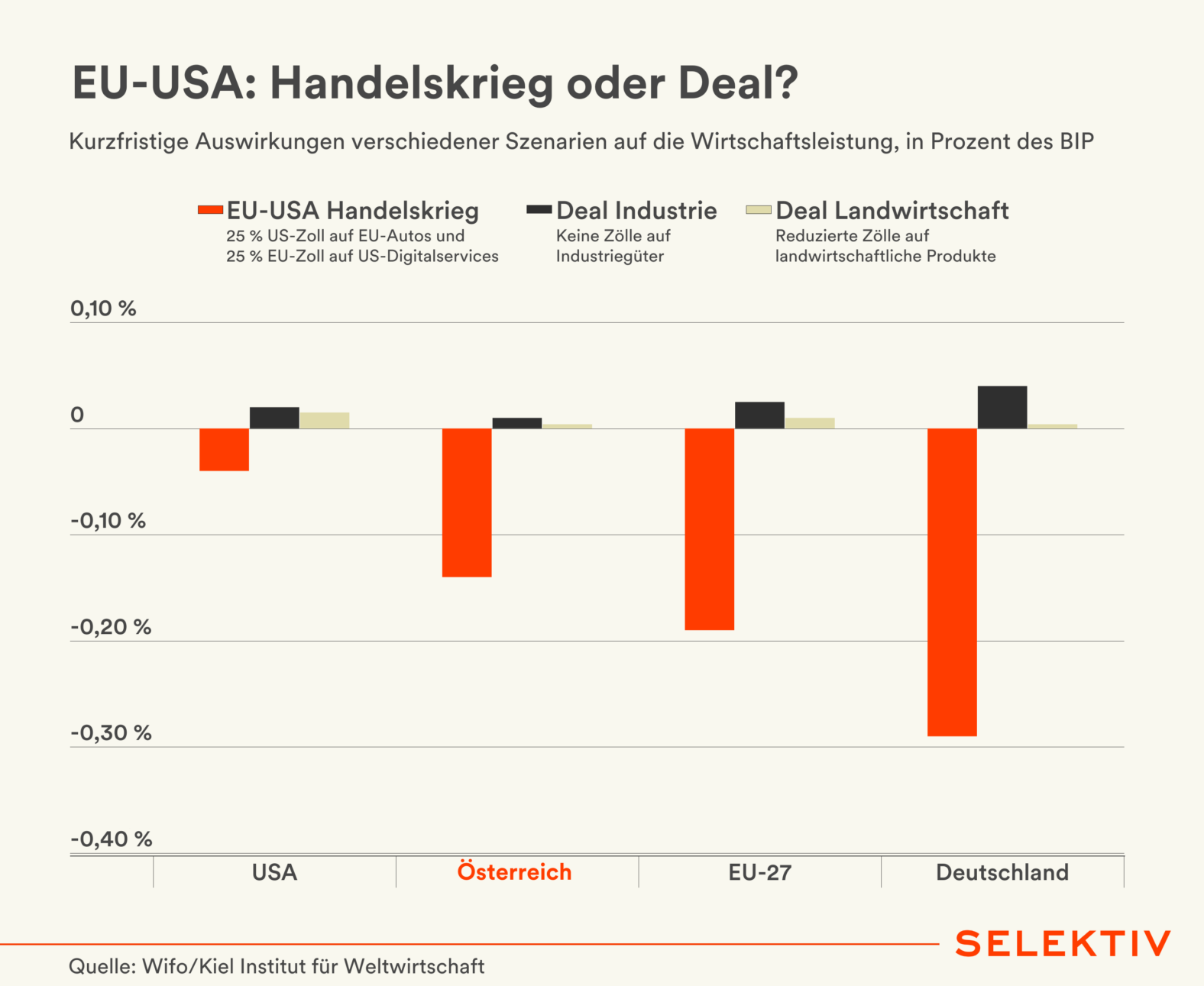 Grafik (von Sara Grasel und Christoph Hofer): Ein Handelskrieg zwischen den USA und der EU könnte Österreich kurzfristig 0,14 Prozent des BIP kosten. Die Verluste im EU-Schnitt (-0,19 Prozent) sowie für Deutschland (-0,29 Prozent) wären noch höher. Die Wirtschaftsleistung der USA würde hingegen nur leicht zurückgehen (-0,04 Prozent). Handelsdeals bzw. Zollreduktionen in den Sektoren Industrie und Landwirtschaft böten hingegen für beide Seiten Wachstumspotentiale. [Quelle: Wifo/Kiel Institut für Weltwirtschaft]