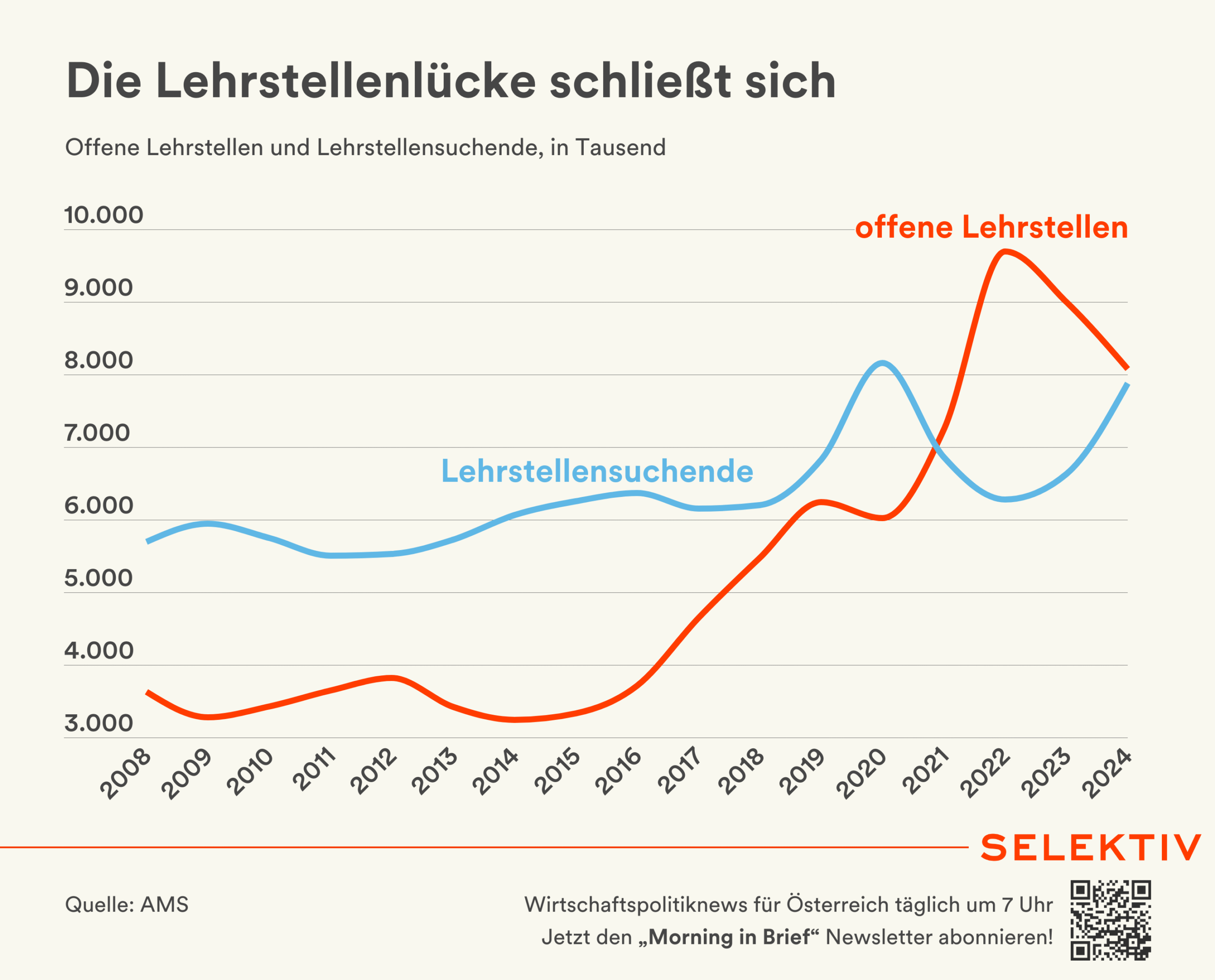 🇦🇹 Fachkräftelücke könnte 2,6 Mrd. Euro kosten. Bis zum Jahr 2029 entsteht durch die Pensionierung von Personen mit Lehrabschluss eine Fachkräftelücke von rund 51.000 Personen. Kumuliert ergibt sich dadurch bis 2029 ein BIP-Rückgang von 0,5 % bzw. 2,6 Mrd. Euro. Würden jedoch 40.000 Pflichtschulabsolventen „aufqualifiziert“ werden, würde das BIP 2029 um 0,1 % bzw. 0,5 Mrd. höher ausfallen. Die AK plädiert daher auf eine zügige Umsetzung der im Regierungsprogramm festgehaltenen Fachkräftestrategie. Die IV und die Lehrlingsinitiative zukunft.lehre.österreich (z.l.ö.) fordern angesichts sinkender Lehrabsolventenzahlen (-1,7 %) eine durchgängige Berufsorientierung an allen Schulen sowie eine Bildungspflicht bis zum 14. Lebensjahr. IV und z.l.ö. fordern auch die Einrichtung einer eigenen Stabsstelle, bisher sind 4 Ministerien für die Lehre zuständig. [Quellen: AK-Pressegespräch, IV-Pressegespräch, Wifo-Studie im Auftrag der AK | Grafik: Die Lehrstellenlücke schließt sich]