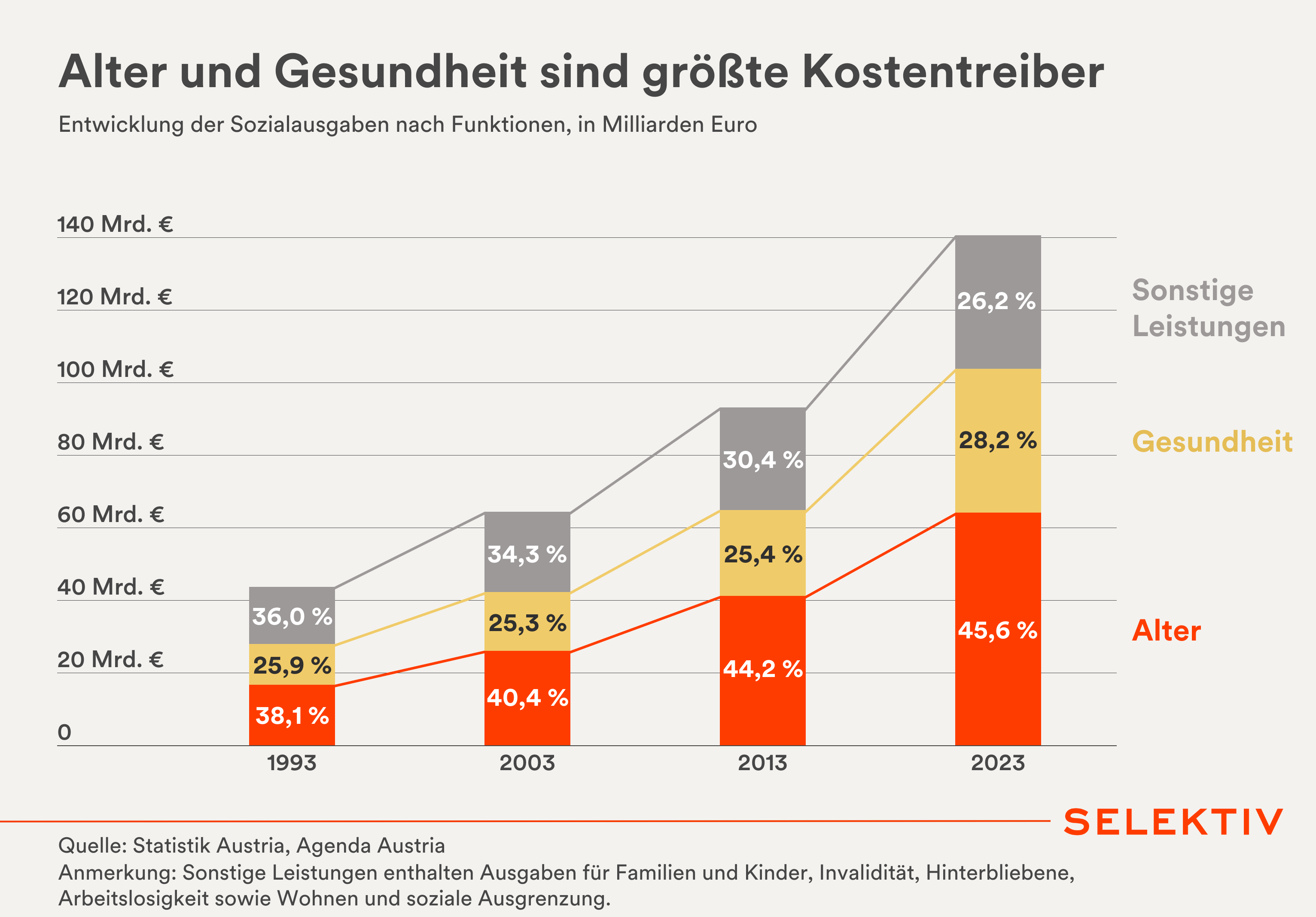 Grafik: Knapp 3/4 der heimischen Sozialausgaben bzw. mehr als 100 Mrd. Euro floßen 2023 allein in die Bereiche Alter und Gesundheit. Das ist ein Anstieg im Vergleich zum Jahr 1993 um knapp 10 Prozentpunkte. Vor allem die Demografie treibt die altersbedingten Kosten in den nächsten Jahren zunehmend. Schon jetzt ist der Zuschuss zu den Pensionen der größte Ausgabenposten des Staates. Um die steigenden Ausgaben einzufangen schlägt die Agenda Austria in ihrer neuen Studie u.a. die automatischen Anpassung des Pensionsantrittsalters an die Lebenserwartung sowie die Einführung einer Ausgabenbremse vor.