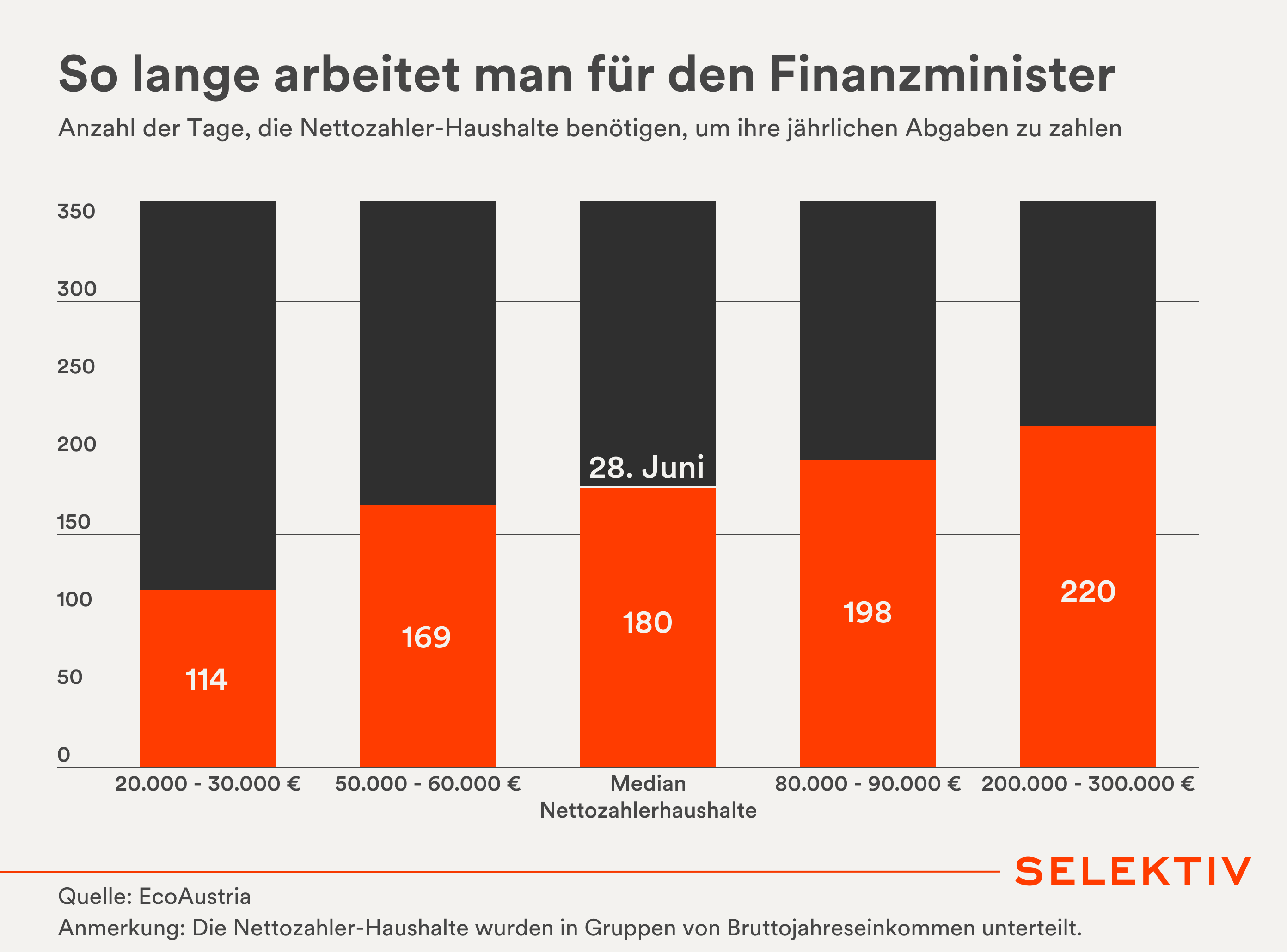 Grafik: Eine neue Studie von EcoAustria ergab, dass ein mittlerer Nettozahler-Haushalt in Österreich bis heute den 28. Juni nur dafür arbeiten muss, alle Abgaben und Steuern für das Jahr an den Staat abzuliefern. Erst ab morgen wird in die eigene Tasche gewirtschaftet.