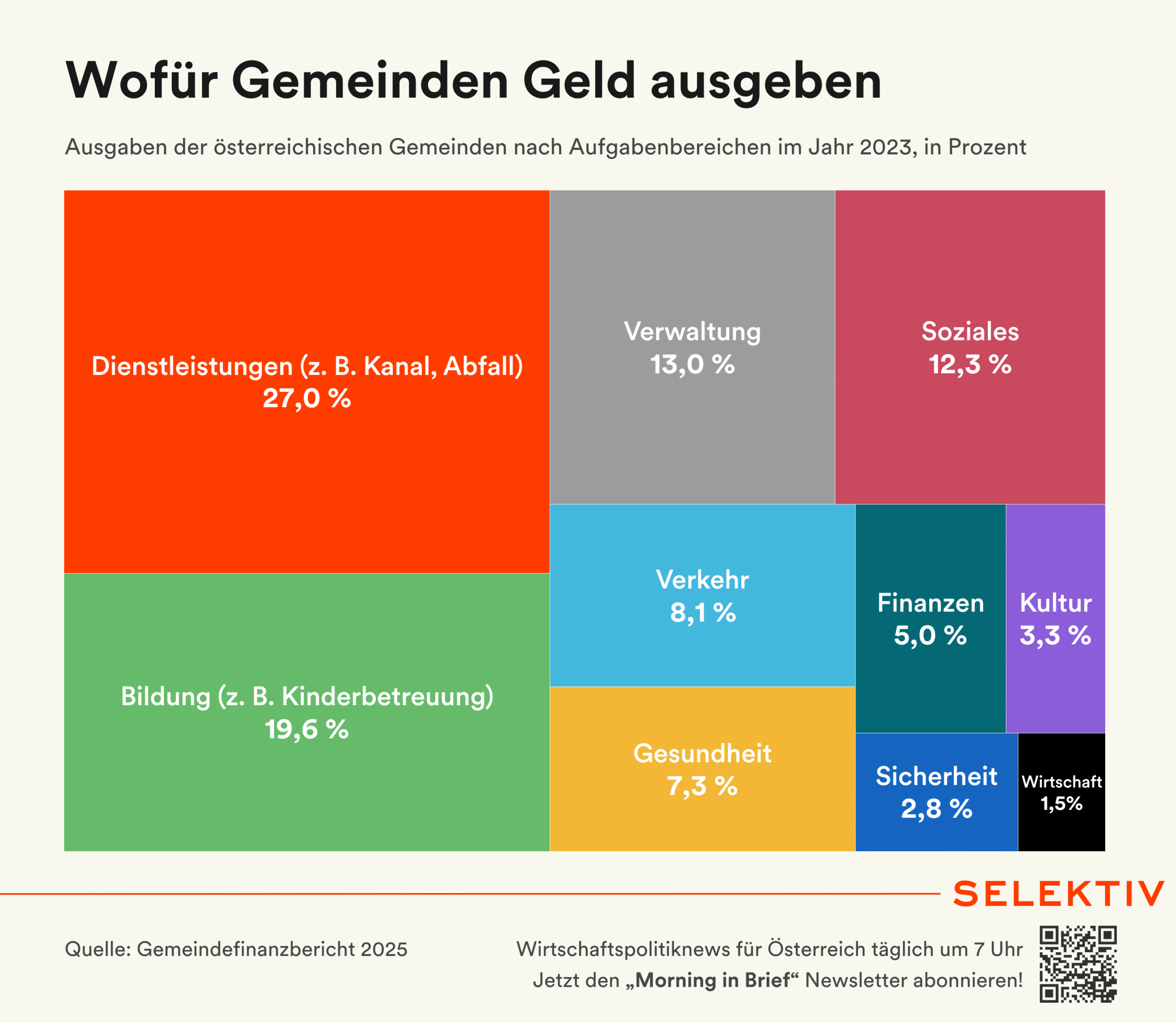 💡 Jeder fünfte Gemeindeeuro fließt in Kindergärten und Co. 2023 beliefen sich die gesamten Ausgaben der österreichischen Gemeinden auf rund 26,2 Mrd. Euro. Davon entfielen 19,6 % (5,1 Mrd. Euro) auf den Bereich Bildung – ein Plus von 81,6 % in den letzten zehn Jahren, vor allem durch den forcierten Ausbau von Ganztagsschulen und Kinderbetreuungsplätzen. Den größten Anteil hatten weiterhin die kommunalen Dienstleistungen wie Kanal, Wasser, Abfall und Straßenreinigung mit 27,0 % (7,1 Mrd. Euro). Überdurchschnittlich stark gestiegen sind auch die Ausgaben für Sicherheit (+56,9 %) sowie Soziales (+54,6 %). [Quellen: Gemeindefinanzbericht 2025, dieSubstanz.at | Grafik von Christoph Hofer]