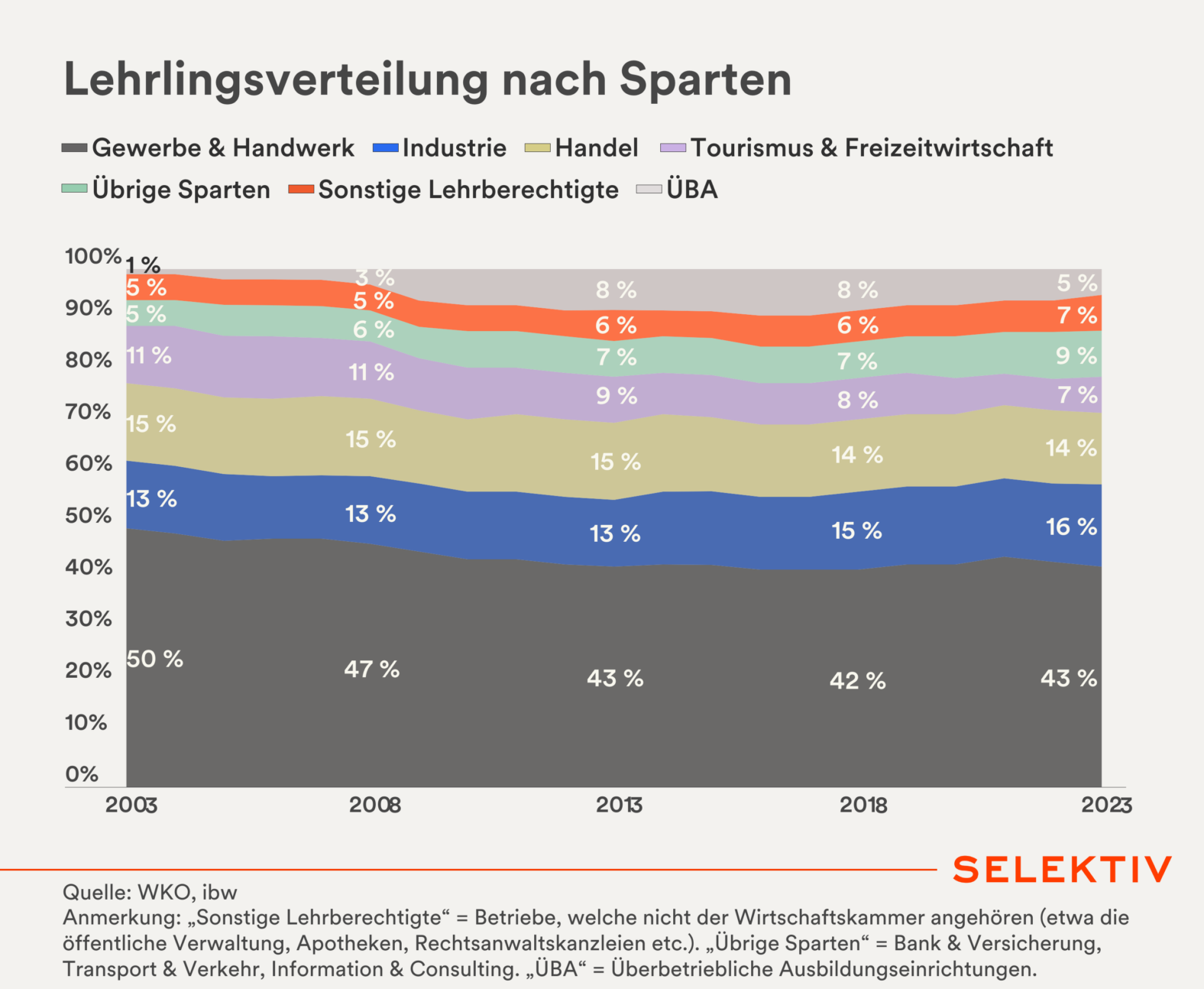 Grafik: In den letzten 20 Jahren ging der Anteil an Lehrlingen am stärksten in den Sparten „Tourismus & Freizeitwirtschaft“ (2003: 11 Prozent, 2023: 7 Prozent) sowie „Gewerbe und Handwerk“ (2003: 50 Prozent, 2023: 43 Prozent) zurück. In der Industrie hat es seit Anfang 2000 hingegen eine anteilsmäßige (und auch absolute) Zunahme an Lehrlingen gegeben (2003: 13 Prozent, 2023: 16 Prozent). Ein Auf und Ab erlebten die Überbetrieblichen Ausbildungseinrichtungen (ÜBA). Vor 20 Jahren kaum vorhanden steigerten sie ihren Anteil auf bis zu 9 Prozent (2016) aller Lehrlinge. Nach einem Rückgang in den letzten Jahren liegen sie nun bei 5 Prozent (2023).