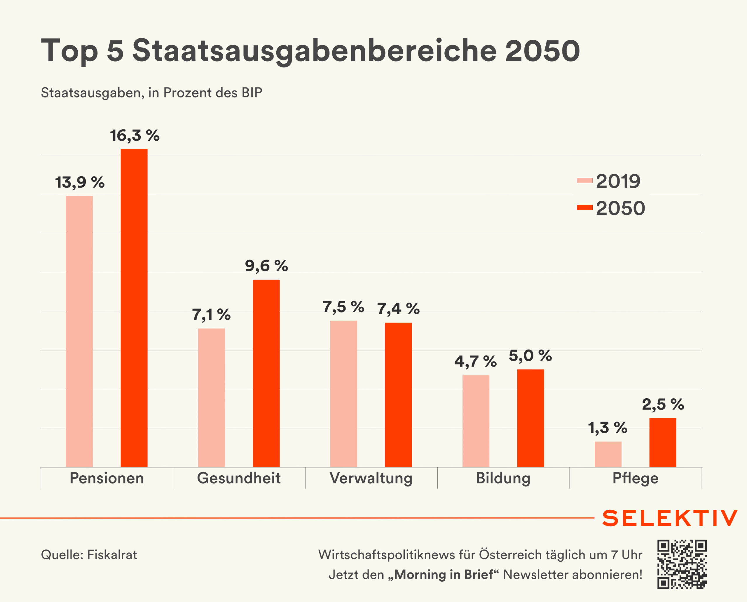 Grafik (von Christoph Hofer): Laut Fiskalrat-Prognose steigen die Staatsausgaben gemessen am BIP von 47,6 % im Jahr 2019 auf 55,9 % im Jahr 2050. Dies entspricht Mehrausgaben von rund 32,8 Mrd. Euro im Vergleich zu 2019. Die Haupttreiber dieser Entwicklung sind Pensionen (+2,4 %), Gesundheit (+2,5 %) und Pflege (+1,2 %). Die Ausgaben für Verwaltung (-0,1 %) und Bildung (+0,3 %) bleiben hingegen nahezu konstant. Hauptursache dieser Entwicklung ist der demografische Wandel: Laut Statistik Austria wird die Bevölkerung über 65 Jahre zwischen 2023 und 2050 um etwa 950.000 Personen ansteigen. [Quellen: Fiskalrat, dieSubstanz.at]